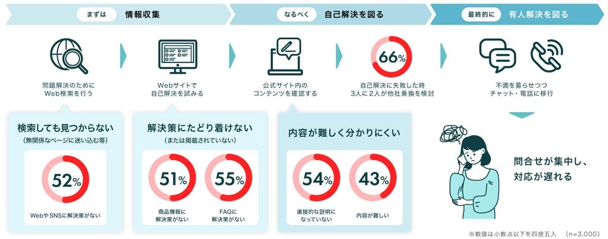 トランスコスモス、「カスタマージャーニーの急所は自己解決。失敗すると3人に2人は他社乗換を検討」との調査結果を発表