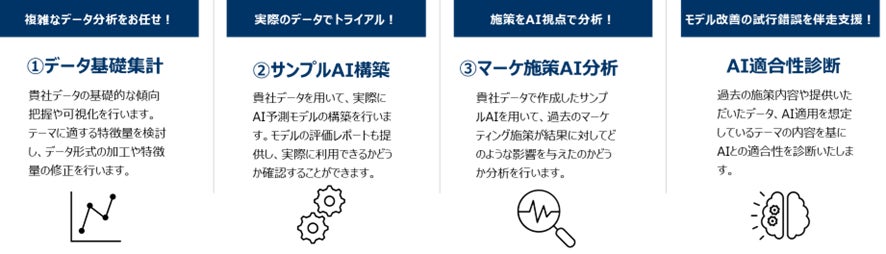 これにより、本サービスの利用企業は手間をかけることなく、過去に実施したマーケティング施策のうち影響度の大きい施策を洗い出し、今後の運用改善の示唆(ヒント)を得ることができます。同時に、AI導入による効果が得られるかについて実証実験を手軽に実施できます。