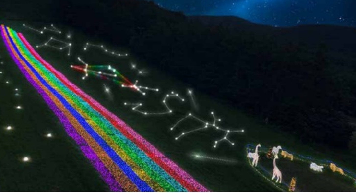 今年で12年目を迎える本イベントは、光の天の川を中心に花や動物などをモチーフにしたイルミネーションが光り輝くあだたら高原リゾートの夏の風物詩です。今年の見どころは、ゲレンデに広がる光の天の川に、昨年好評だった「夏の大三角形」「カシオペア座」などに加え、「てんびん座」「さそり座」「いて座」といった夏の星座が新たに加わりスケールアップした星座のイルミネーションです。そのほか、「ADATARA LOVE」をテーマにした「ハートのオブジェ」や「光のひまわり回廊」など、夜の安達太良山を美しく彩ります。