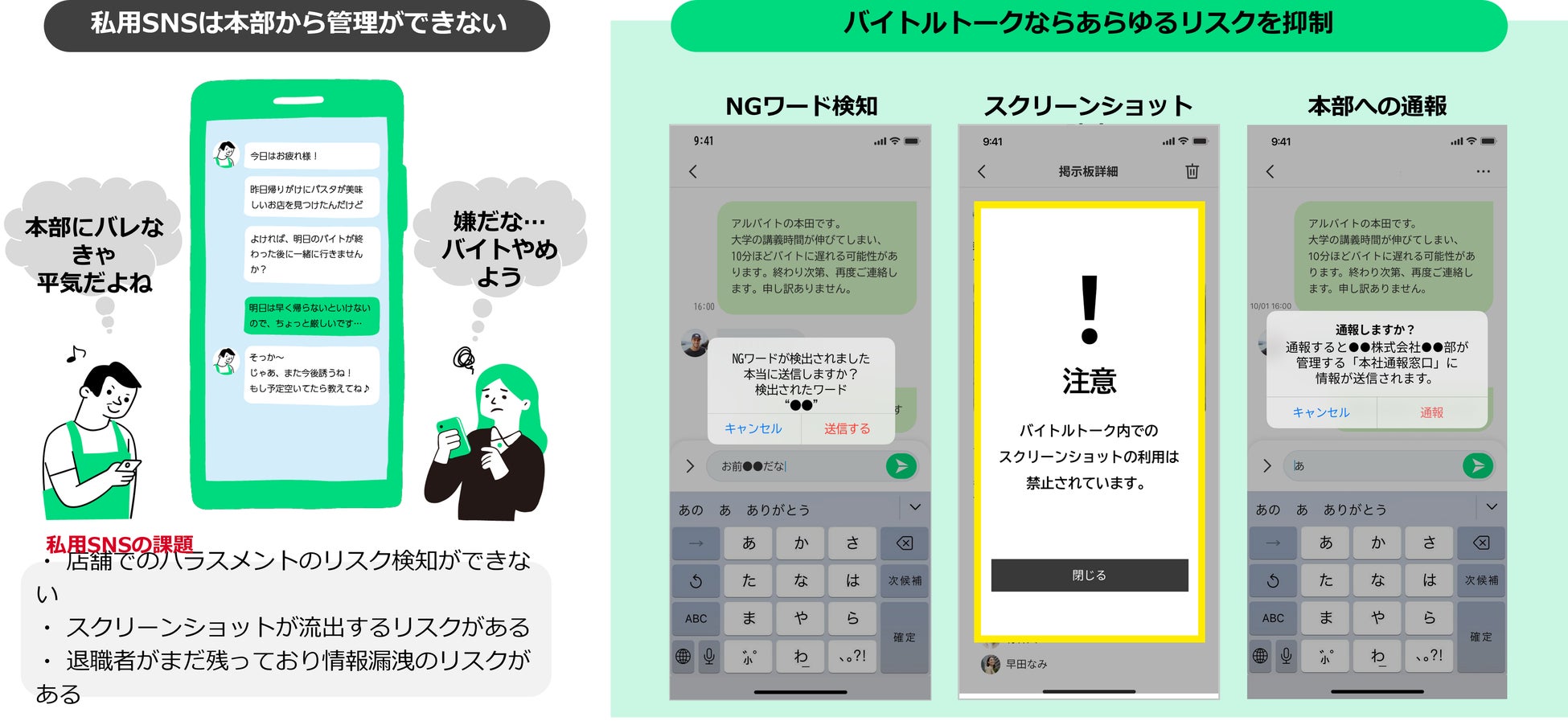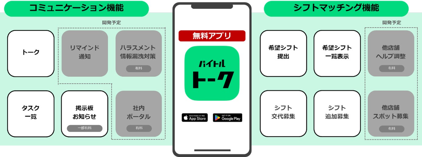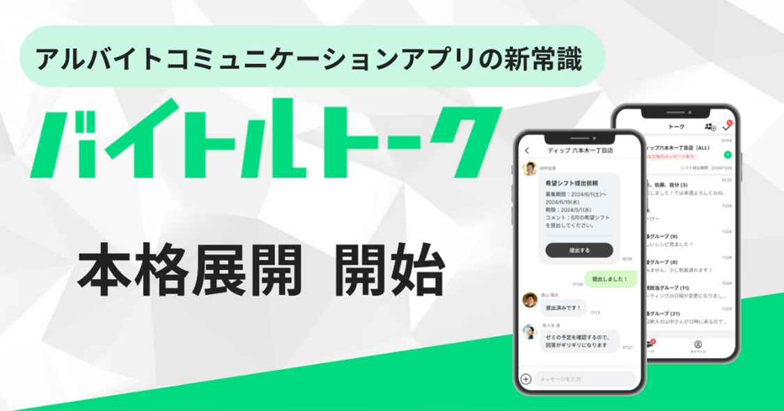 ディップ株式会社(以下「当社」)と株式会社アイリッジ(東京証券取引所グロース:3917、以下「アイリッジ」)が共同で開発した店舗管理者とアルバイト従業員のコミュニケーションを改善するサービス「バイトルトーク」(以下「本サービス」)が新たな機能を搭載し、本日より本格的に企業へのサービス提供を開始いたしました。