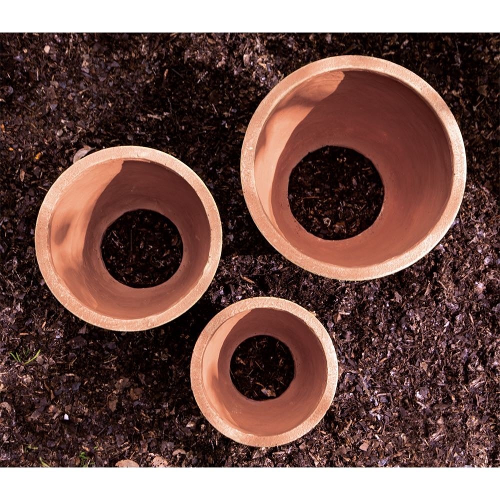 ⽔はけのいい⼟で⾼植え**にすれば夏をしのげる植物も多いですが、広い範囲の⼟壌改良は⼤変。⾼植えにしても⼟が流れることもあります。対策として植⽊鉢を埋め込む⽅法は昔からありますが、市販の植⽊鉢の底を抜くのは⼤変です。そこではじめから底なしの植⽊鉢が欲しいと思いました。素焼きの底なし植⽊鉢の下部を⼟に埋め込み、植⽊鉢の中だけ、⽔はけのいい配合の⼟を⼊れます。これなら⼟も流れ出ないし、⾵通しも良くなります。底がないので植物が根を張りやすい上、植える⾼さが調節でき、庭のデザインにも⼀役買います。