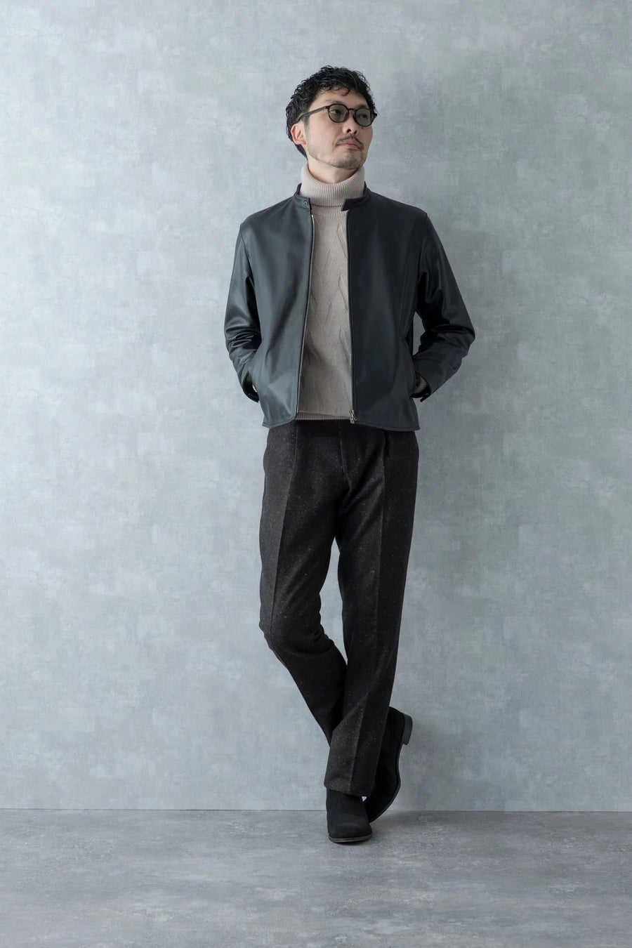 ボックスシルエットの程よく抜け感のあるゴート(山羊)レザーアウターと立体的な編み柄がラグジュアリーな印象のタートルネックニットを合わせた都会的な印象のスタイル。ウール素材の温もりをプラスすることで、ハードになりすぎない都会的な印象のスタイルに仕上がります。ダークグリーンのウールパンツと足元をレザーシューズで引き締めたコーディネートです。