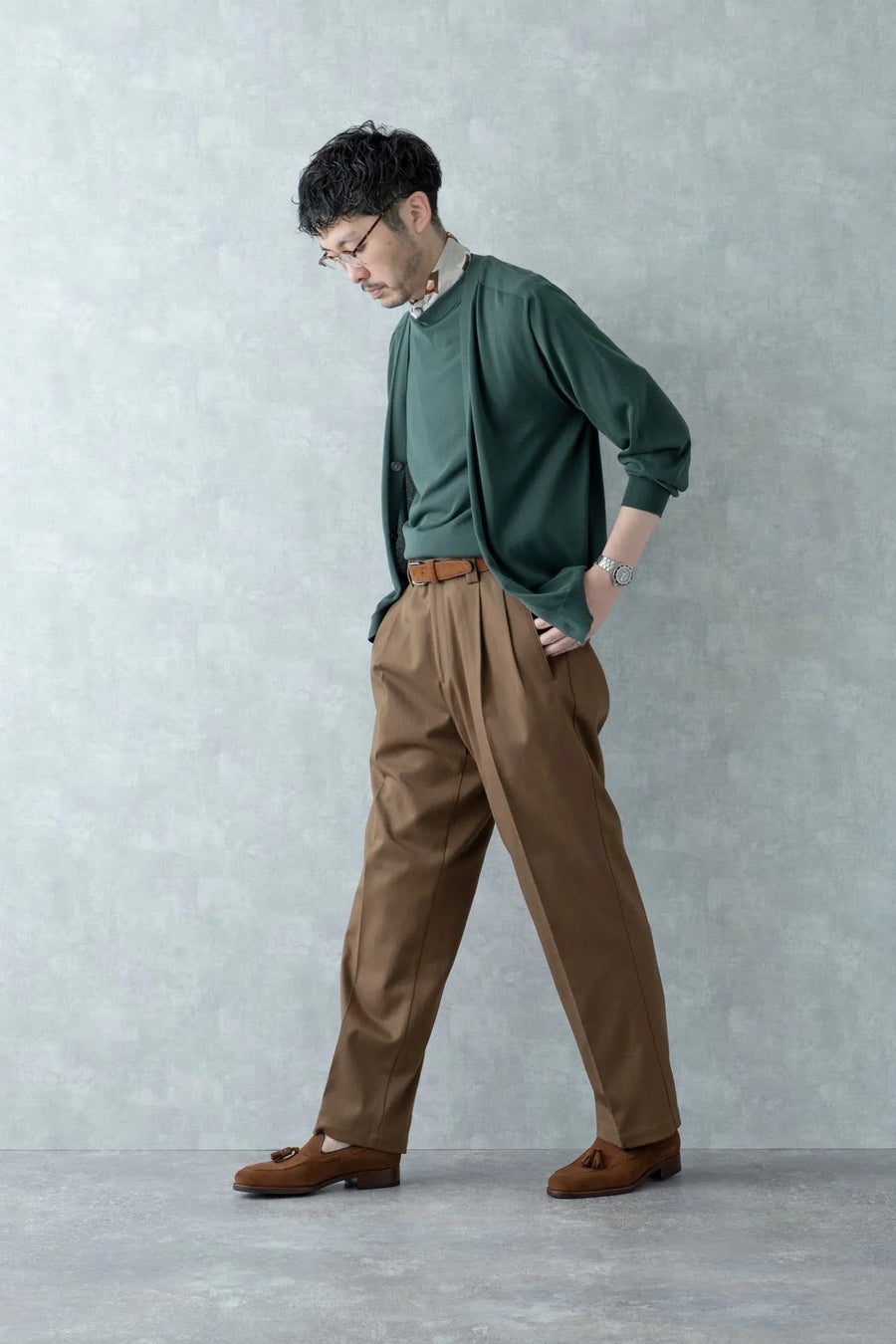 きちんと見えするアンサンブルニットにリラックスシルエットのトラウザーズを合わた秋のキレイ目カジュアルスタイル。トラウザーズにはウールブレンド素材ならではの上品な風合いと程よい光沢感があり、洗練された着こなしを演出してくれます。ブラウン×グリーンの秋を感じさせるアースカラーの組み合わせで、大人の落ち着きを感じさせるコーディネートが完成。