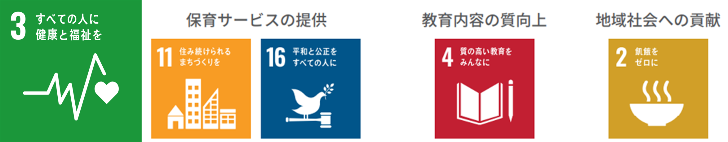 当社では2021年度より「子育てと豊かな社会づくりの星になる。」をスローガンに掲げ、子どもたち、子育てに関わる保護者、保育スタッフまで、子育てに関わるすべての人が「自分らしく生きられる」豊かな社会づくりを目指しています。こうした社会の実現は、いま世界全体で達成すべき目標として掲げられた「SDGs」の目標3「すべての人に健康と福祉を」の実現に貢献すると考えています。当社は目標3への貢献を軸に、「保育サービスの提供」「教育内容の質向上」「地域社会への貢献」の3つの側面からSDGsの達成に貢献し、社会と共にサステナブルな成長を目指します。