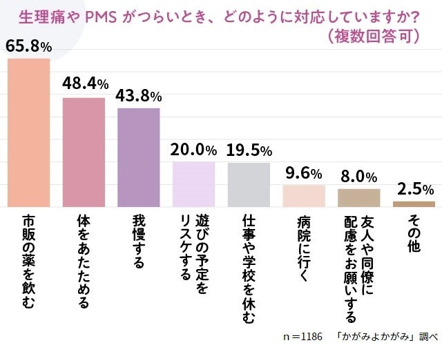 「生理やPMSがつらいとき、どのような対応をしていますか?」との問いに対しては、「市販の薬を飲む」65.8%、「体をあたためる」48.4%に続き、「我慢する」が43.8%でした。