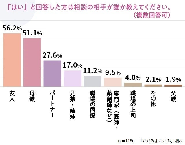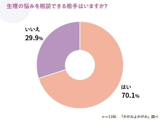 「生理の悩みを相談できる相手はいますか?」との問いに、70.1%が「はい」と回答。そのうち、「相談の相手が誰か教えてください」という質問には、「友人」が最多で56.2%、続いて母親が51.1%。「パートナー」と答えた人は27.6%でした。