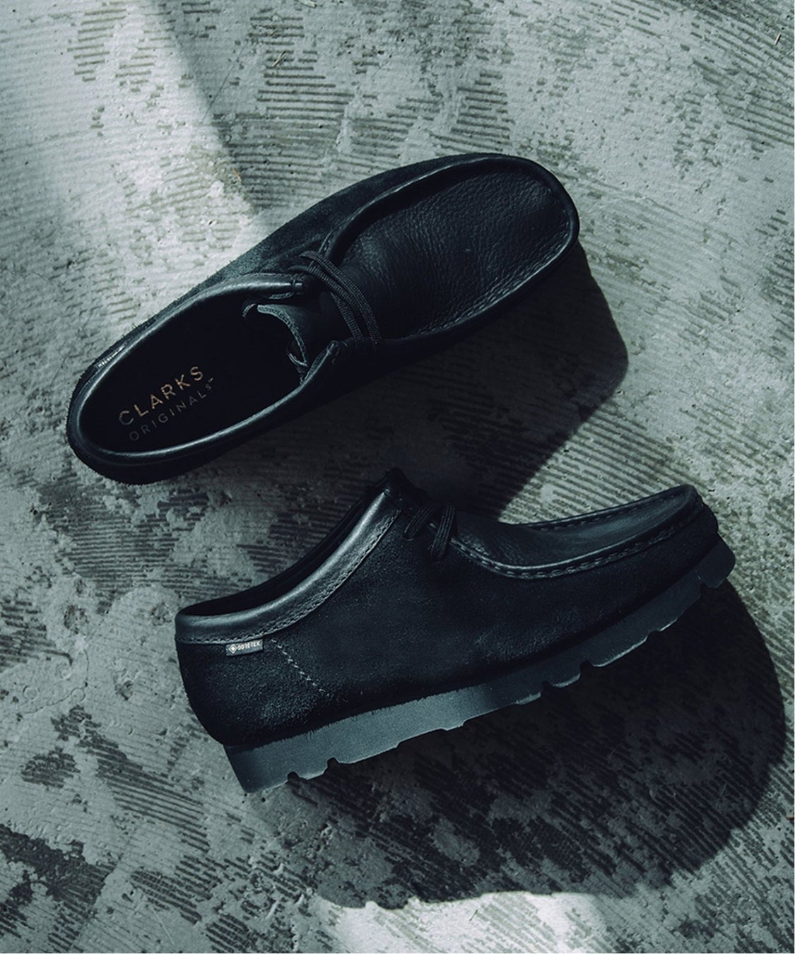 CLARKS ORIGINALSのアイコニックアイテムであるWallabee(ワラビー)のJOURNAL STANDARD別注モデル。ブラックレザーのスウェードのコンビ仕様に変更。防水透湿機能に優れたGore-tex🄬の搭載で雨の日も靴内部をドライに保ちより実用的に履ける一足。