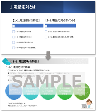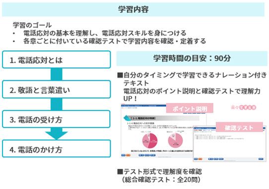 電話応対で第一印象を向上させるコツや敬語・言葉遣いなどのマナー、電話の受け方・かけ方の基本を、コールセンターのプロが丁寧に紹介・解説するとともに、確認テストによる定着を促して、電話応対スキル向上や教育負担軽減と応対品質維持・向上を支援します。