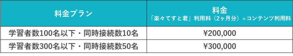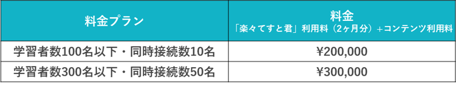 ※ ご利用料金には、「楽々てすと君」利用料(2ヶ月分)+コンテンツ利用料が含まれています。