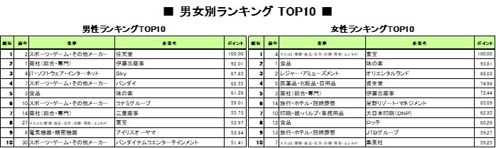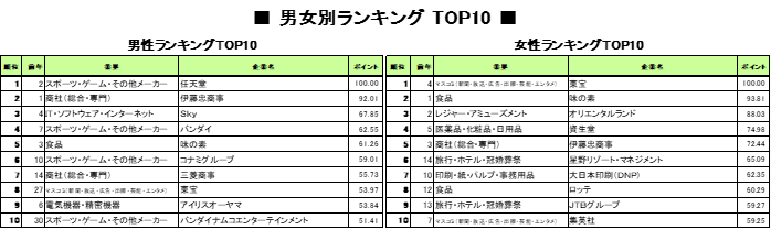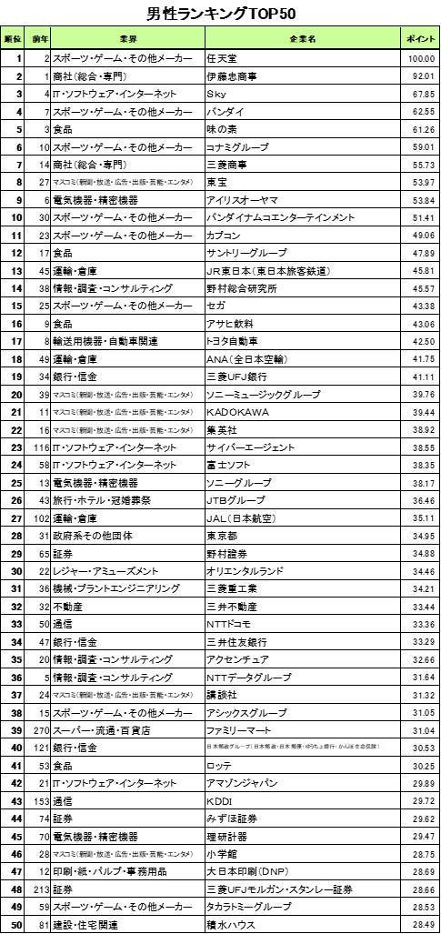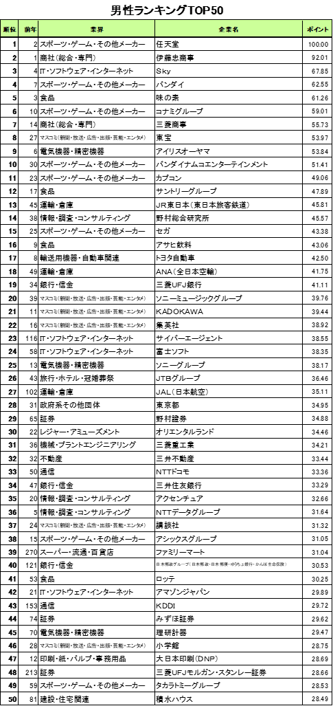 (1)男性部門は任天堂が伊藤忠押さえてトップ。ゲーム大手が上位に。金融業界はトップ50に6社入り復活