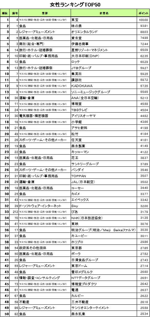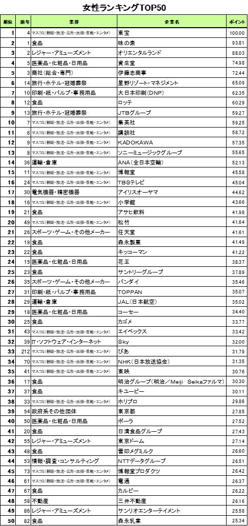 (2)女性部門トップは東宝。トップ50のうち「マスコミ」が16社占める。「食品」は13社、旅行も人気戻る