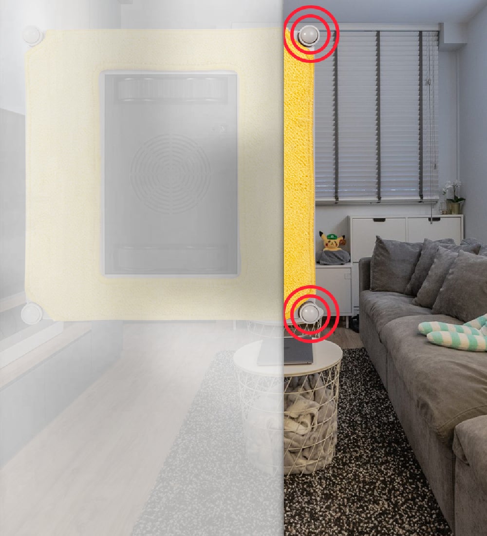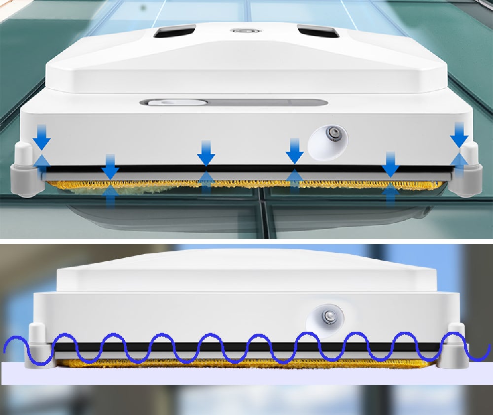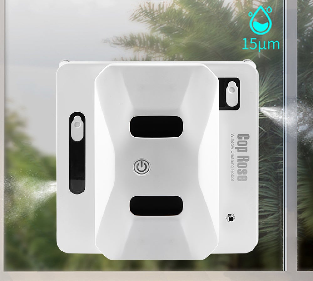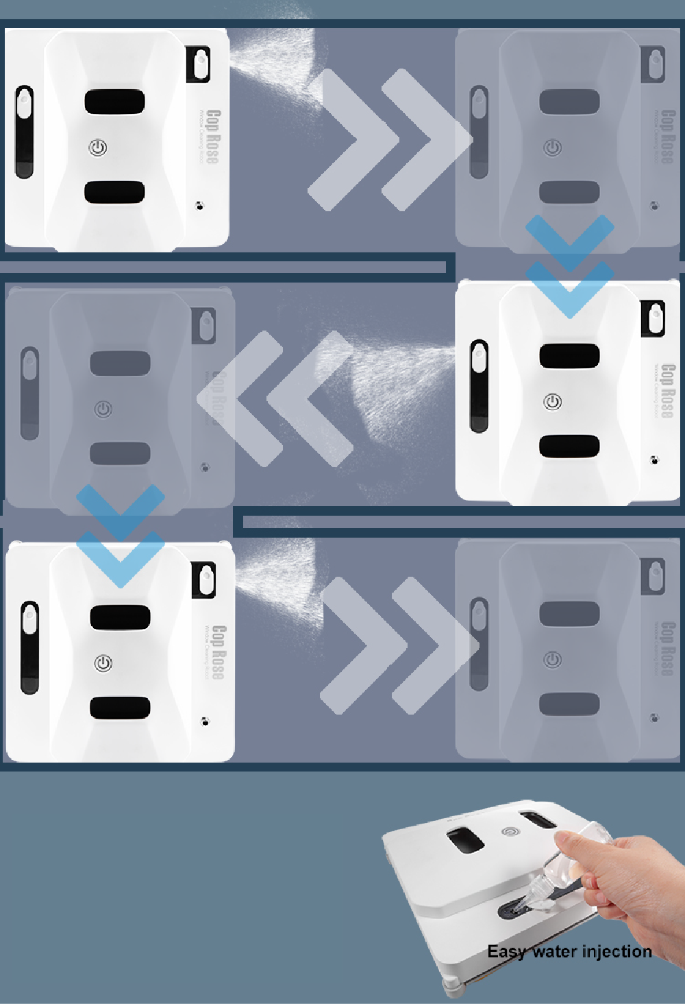 超音波ノズルから水を噴霧します。ノズルは2箇所あるため、より効率的で、短時間で窓掃除を完了できます。 左の水タンクは35mlまでの水を貯めることができ、右の水タンクは容量18mlで、水や洗剤液を保存できます。