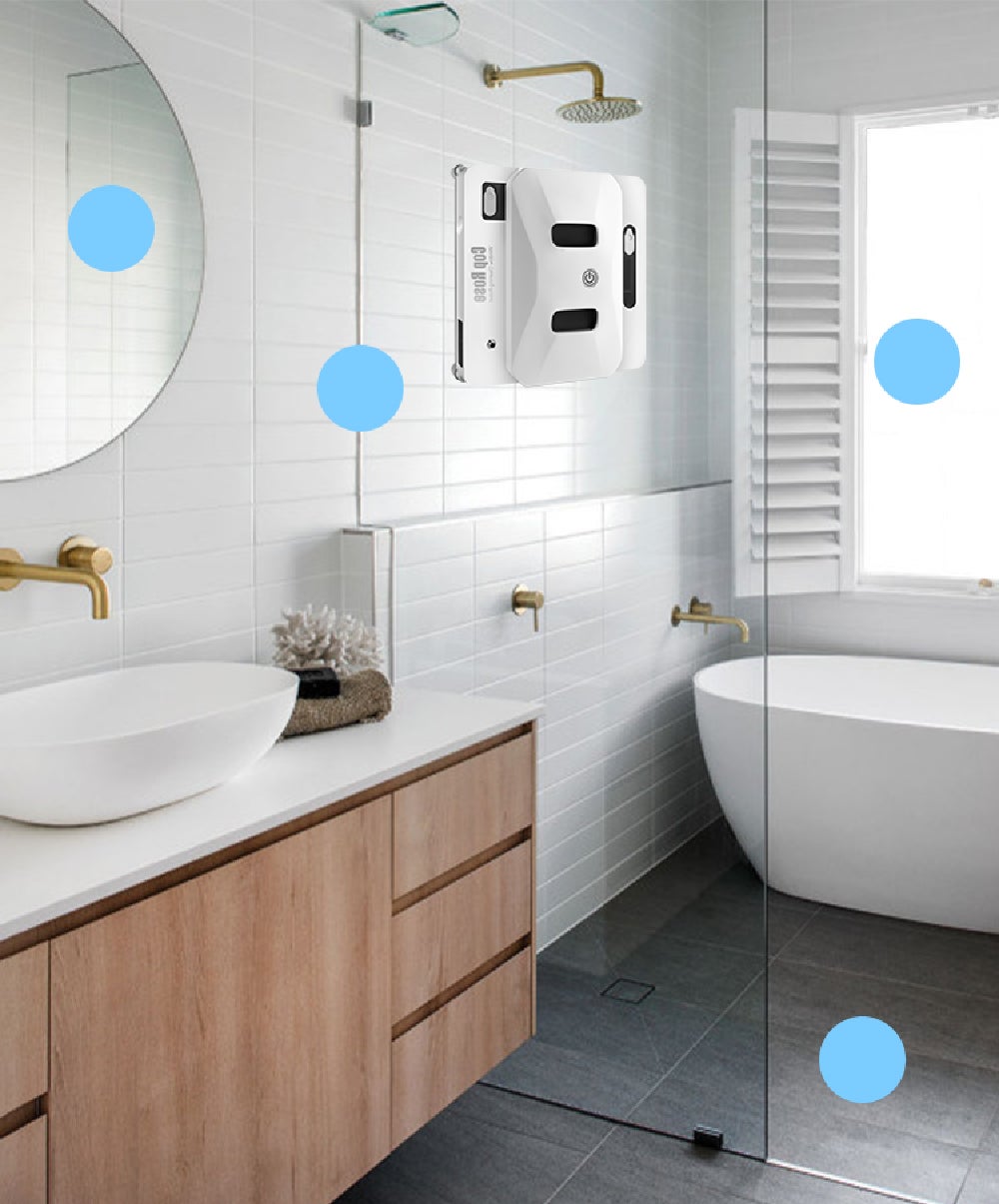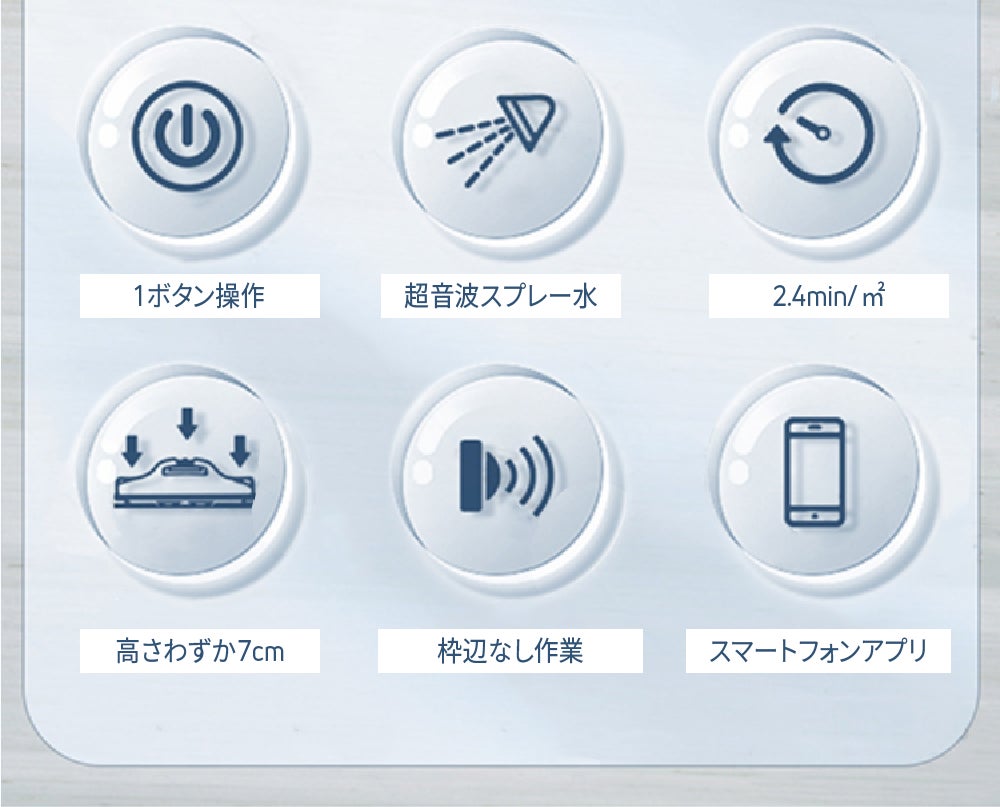 強力吸着/最適なルートで清掃/安全機能搭載/リモコンまたは専用アプリで操作/ガラスミラー/床のタイル/乾拭き仕上げ