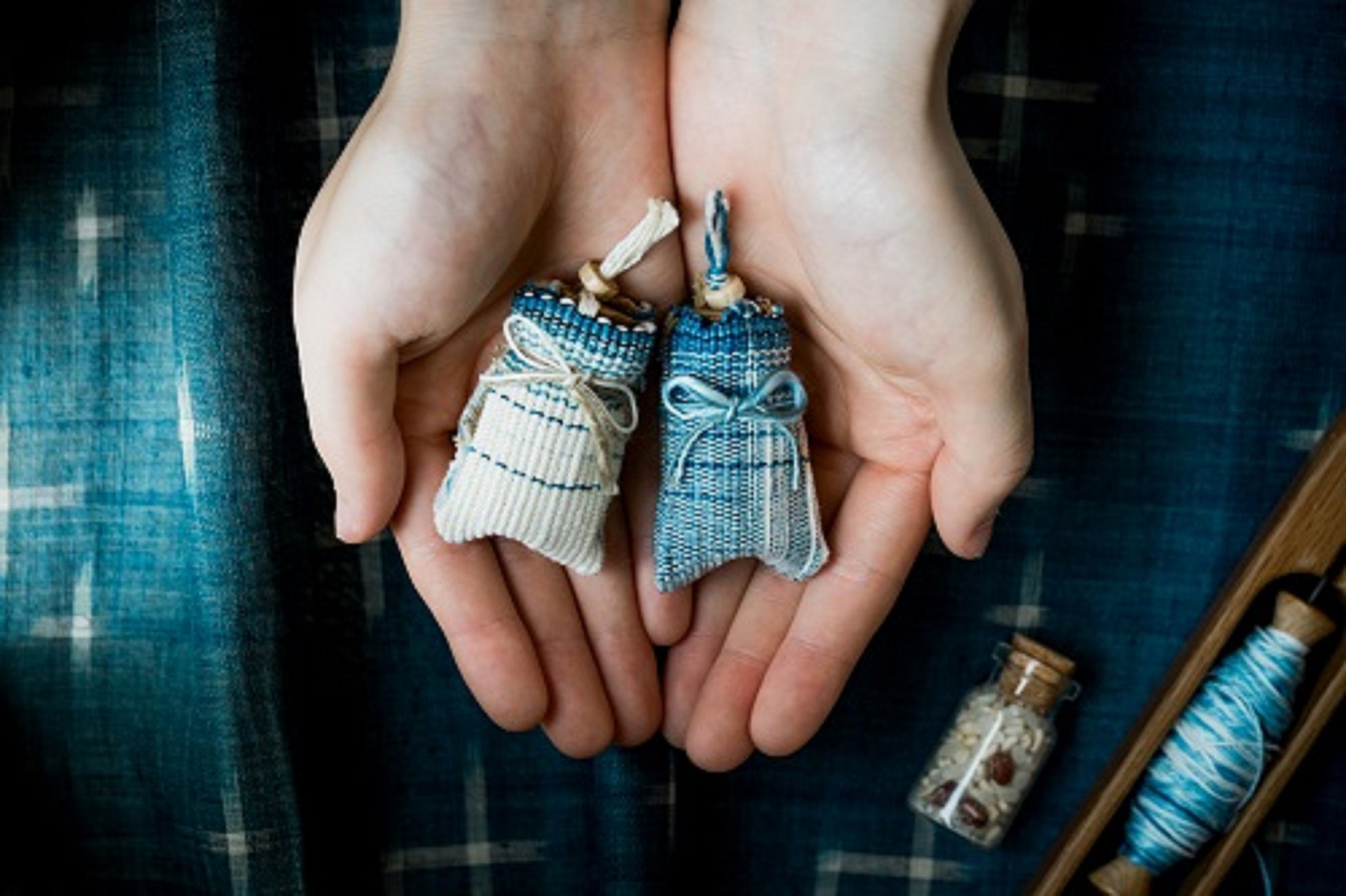 祭事の衣装を織る際に使用される、約100年前に作られた伝統的なはた織り機を用いて、島の植物で染めた糸でお守りの外袋を織り上げます。中には、祭事にちなんだ五穀と魔除けの塩を詰めた小瓶が入っています。このお守りは、神司による祈祷を受けており、竹富島の精神に触れる貴重な品です。