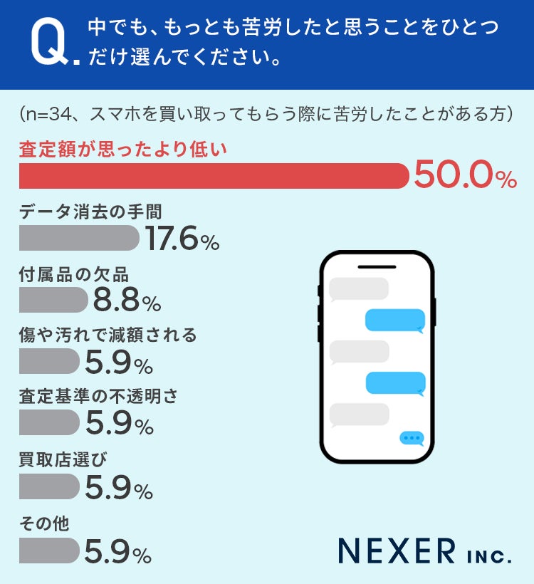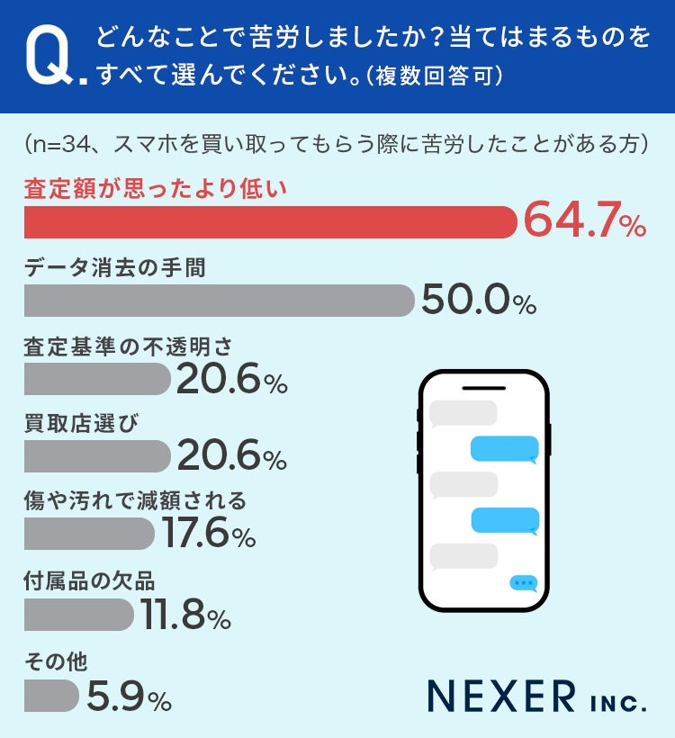 「査定額が思ったより低い」が64.7%、「データ消去の手間」が50%と並びました。