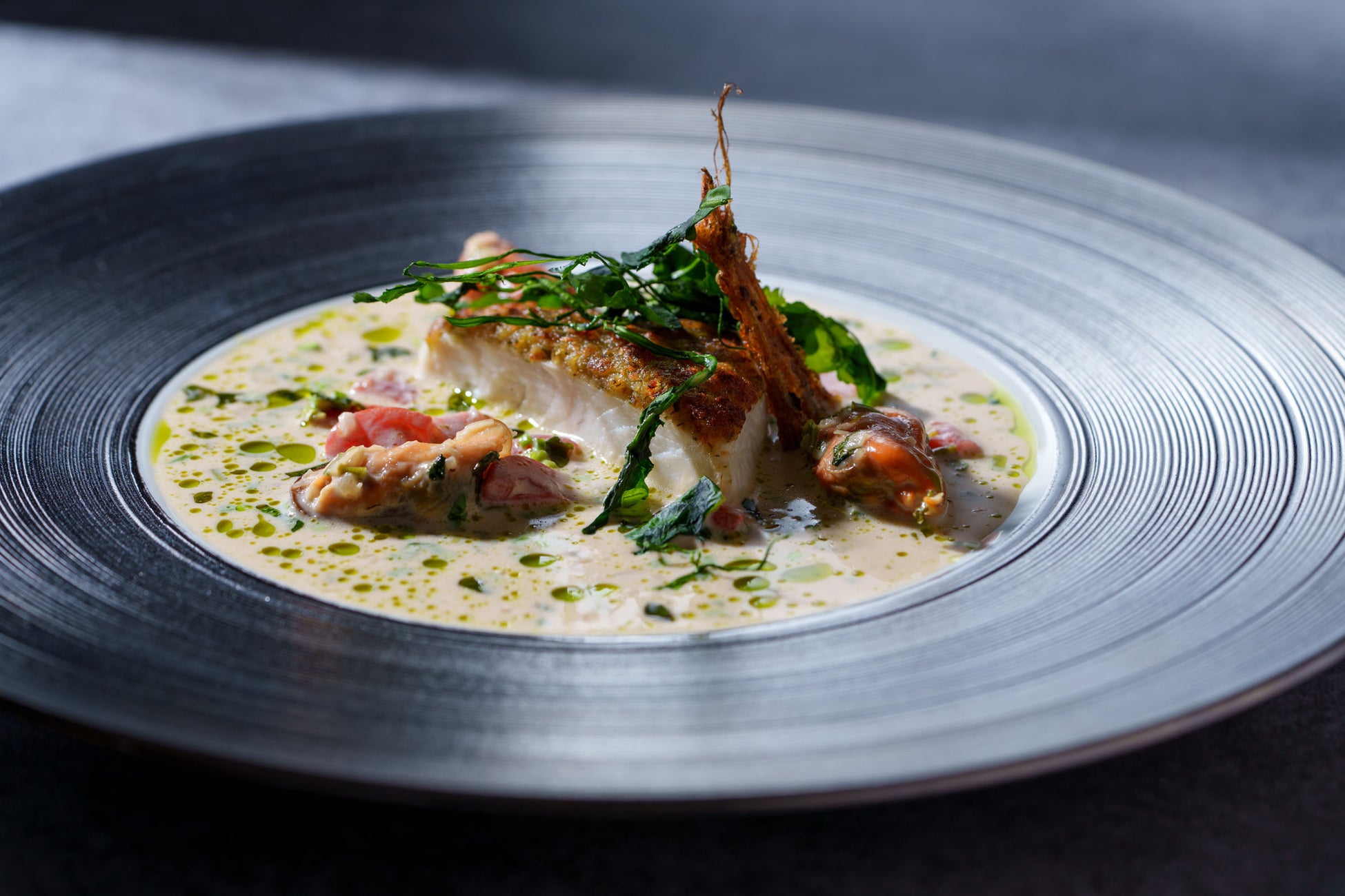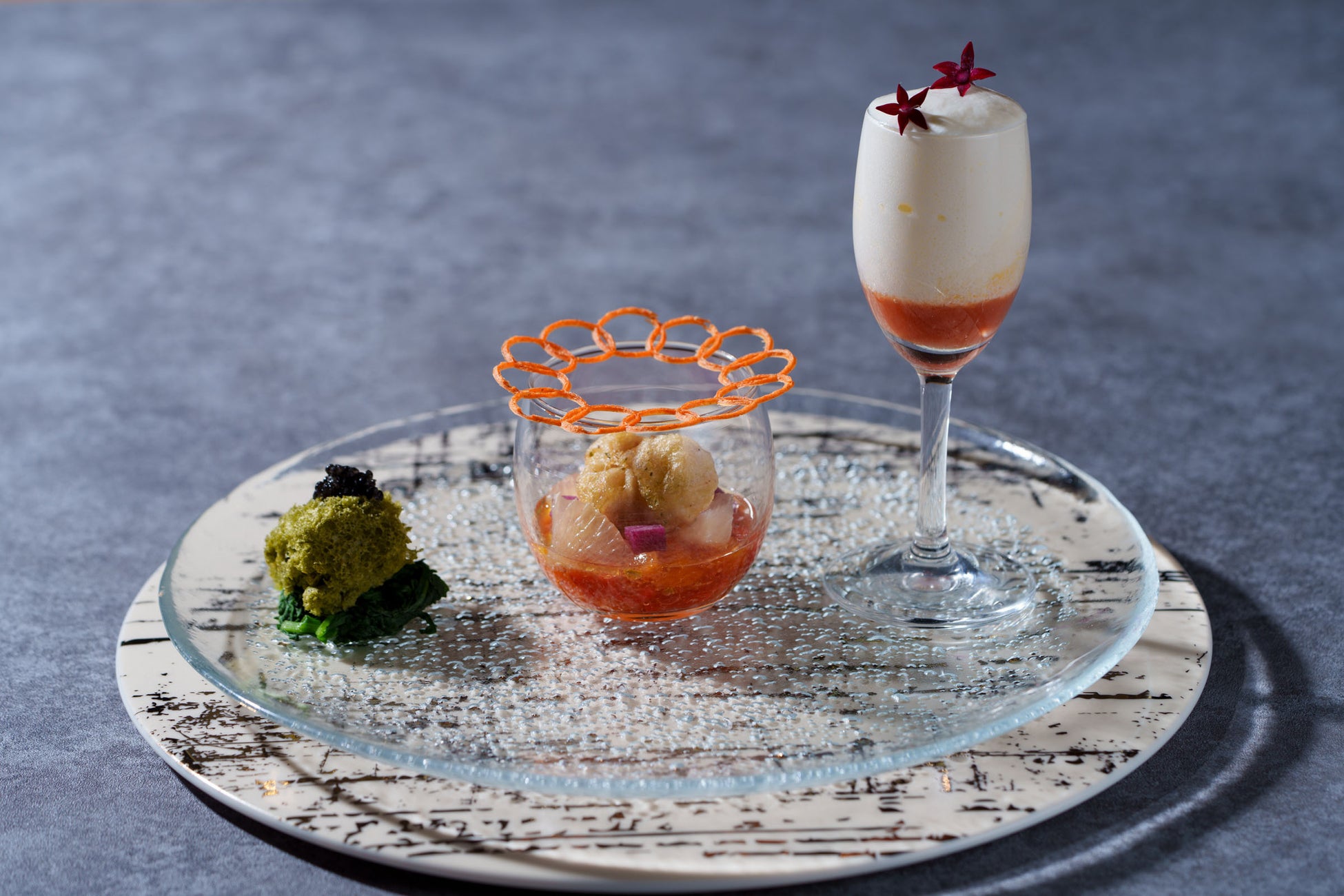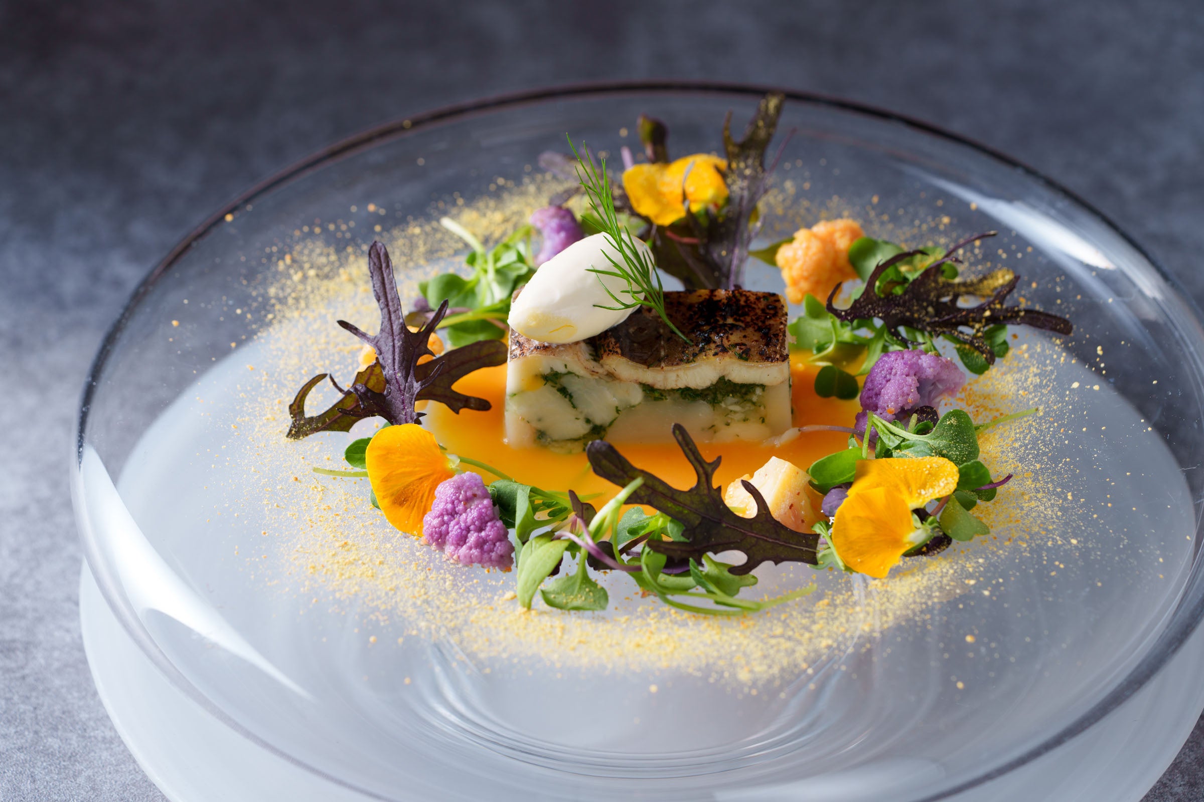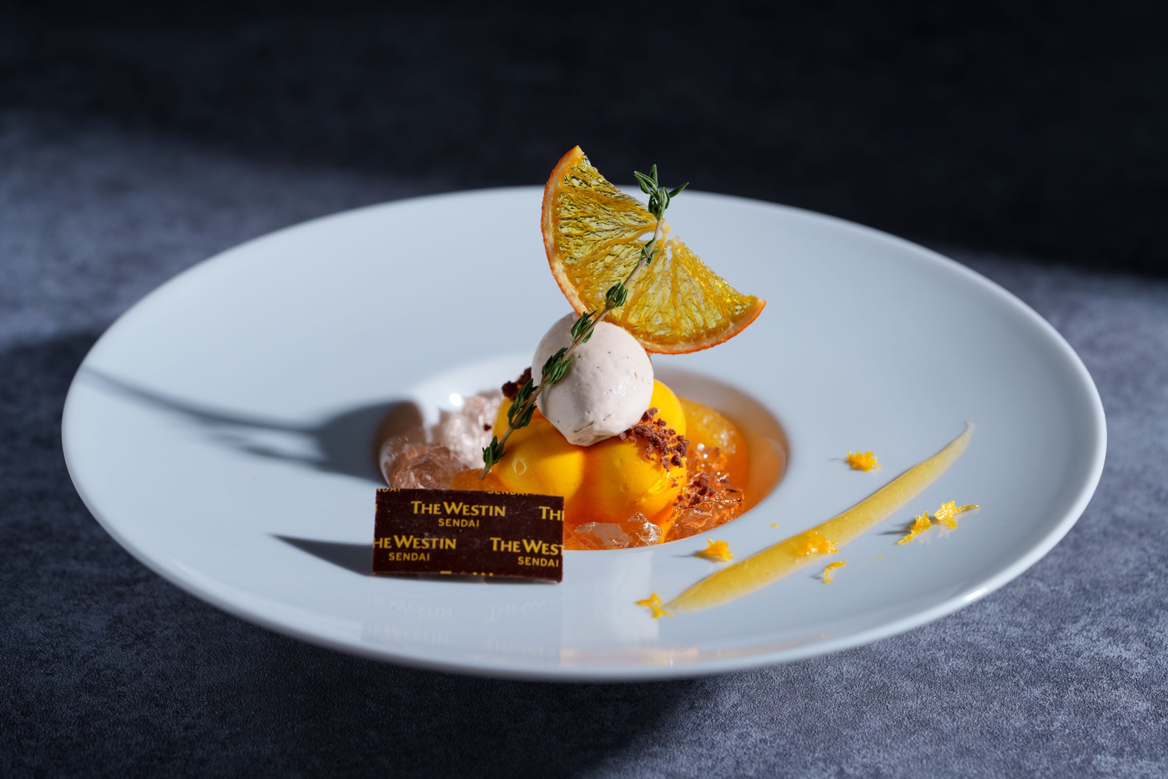 アミューズは、ブラッドオレンジのソースを添えた帆立貝のエスプーマ、キャビアをトッピングした春菊のシフォンサレ、文旦のラビゴットソースが白子の甘みを引き立てるフリットの3種を華やかに盛り合わせました。魚料理は、三陸で水揚げされた平目に、香りがよく独特の風味を持つ仙台せりとパン粉のクルートをのせて、ふっくらと仕立てたロティで。レモンを加えたデュグレレソースが、上品な平目の旨味を引き立てます。肉料理は、岩手県奥州市の広大な土地、美味しい水、きれいな空気のもと、丹精込めて育てられた希少な“江刺牛”を、江刺りんごと岩塩で包み、美味しさを閉じ込めました。爽やかなりんごの香りを纏ったロース肉をトリュフソースが際立たせます。そのほか、アンコウとタラバ蟹のフロマージュ ド テッドや、ちぢみ雪菜とオマール海老のムースをご用意。鮮やかな黄色のデザートは、甘酸っぱいせとかのゼリーをアールグレイのムースで包みました。やさしい甘みのはちみつのソルベとともにお召し上がりください。