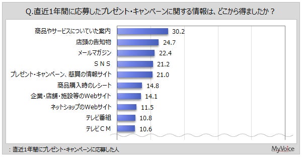 直近1年間にプレゼント・キャンペーンに応募した人の情報入手先は(複数回答)、「商品やサービスについていた案内」が30.2%、「店頭の告知物」が24.7%、「メールマガジン」「SNS」「プレゼント・キャンペーン、懸賞の情報サイト」が各2割強です。