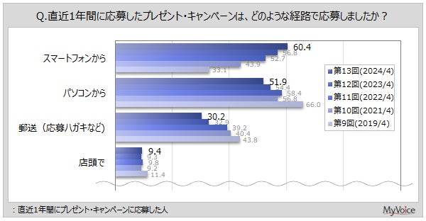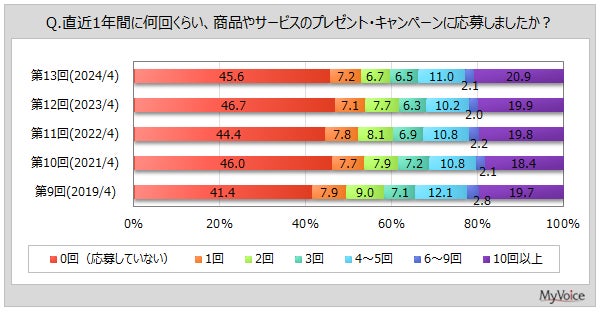<今 回>(2024/4)https://myel.myvoice.jp/products/detail.php?product_id=30905 上記設問の他に、応募したプレゼント・キャンペーンの「提供元」「景品・賞品」なども聞いています。 <第12回>(2023/4)https://myel.myvoice.jp/products/detail.php?product_id=29706 <第11回>(2022/4)https://myel.myvoice.jp/products/detail.php?product_id=28506 |