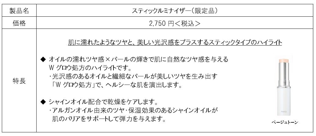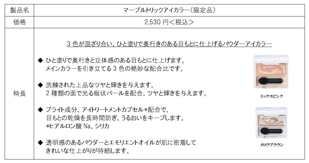 混じり合う色の効果で自然な立体感とほんのり華やかな表情を生み出しながら、スキンケア成分(保湿)の配合で乾燥が気になる春先にも肌にツヤを与えます。
