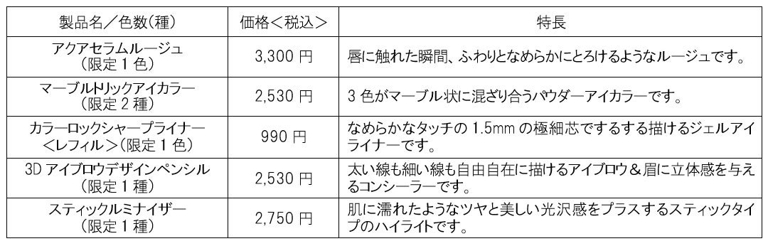 コンセプトは「春の空のような、夢見る色合いのメイクコレクション」。淡い色合いが混じり合う明るく穏やかな春の空をイメージしたコンセプトです。ラインアップは、3色がマーブル状に混ざり合うパウダーアイカラーや、唇に触れた瞬間にとろけるようになじむルージュ、肌にツヤと光沢感を与えるスティックタイプのハイライトなど6アイテムを用意しました。