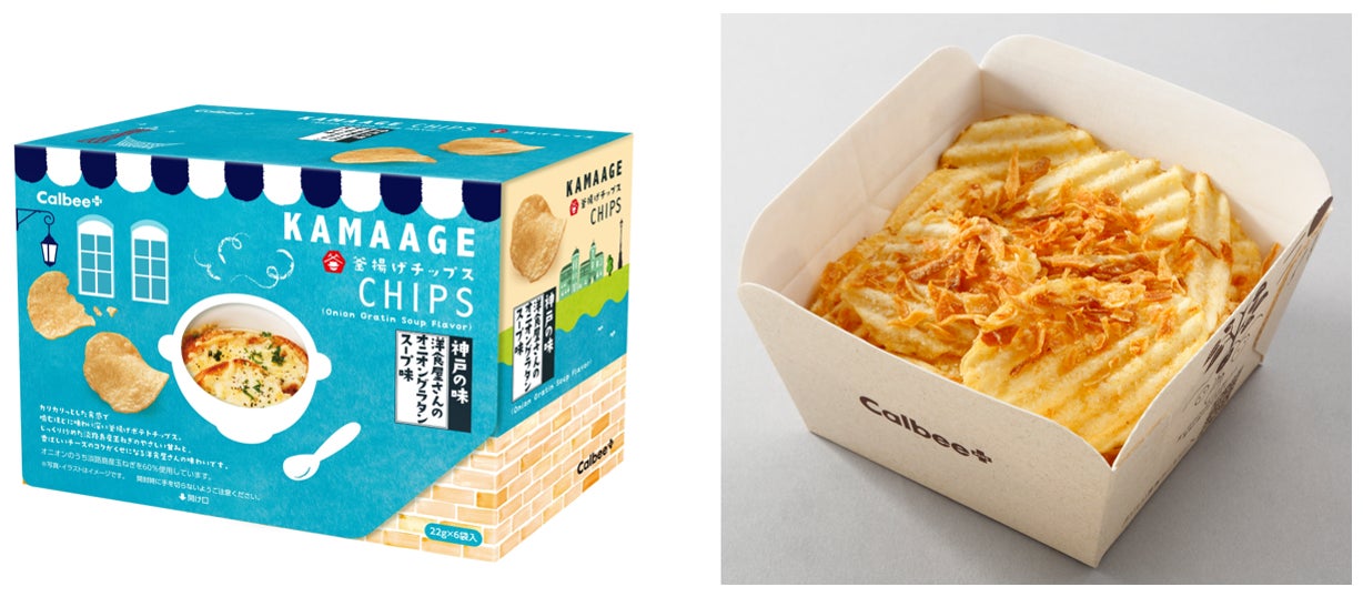 カルビー株式会社(本社:東京都千代田区、代表取締役社長:江原 信)は、アンテナショップ「カルビープラス 神戸ハーバーランドumie店」限定で、お土産商品『釜揚げチップス 洋食屋さんのオニオングラタンスープ味』と、店舗内キッチンから提供する揚げたて商品『揚げたてポテトチップス 洋食屋さんのオニオングラタンスープ味』を2024年12月24日(火)から発売します。