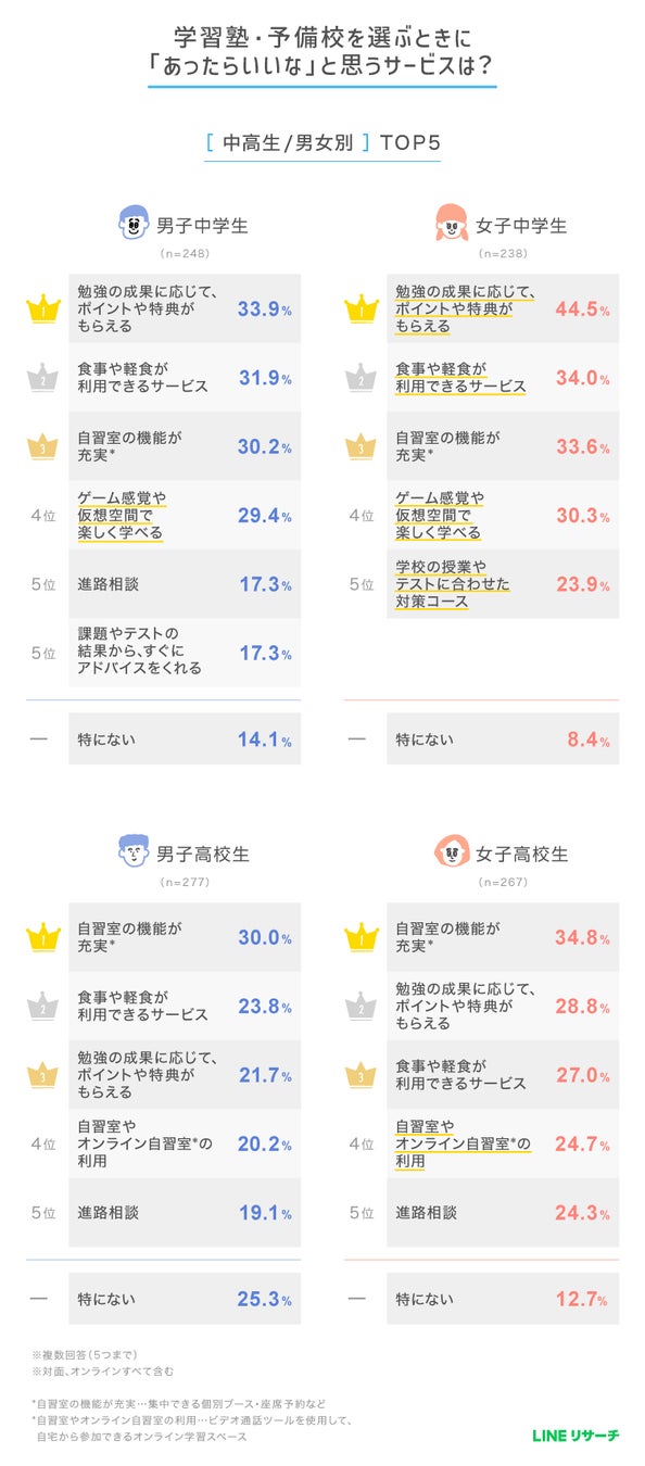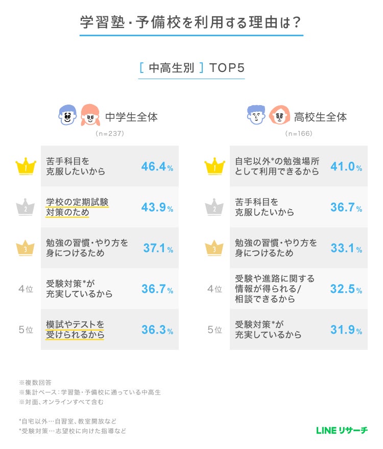 【LINEリサーチ】学校以外の勉強、中学生は「塾」が4割台後半、高校生は「授業のみ」が半数超!塾に求めるサービスは中学生「ポイント・特典」、高校生「自習室の充実」
