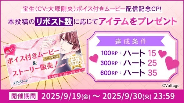 期間中、「100シーンの恋+」公式Xをフォローし、該当ポストをリポストすると、リポスト数に応じてハート(アプリ内アイテム)をプレゼントいたします。
