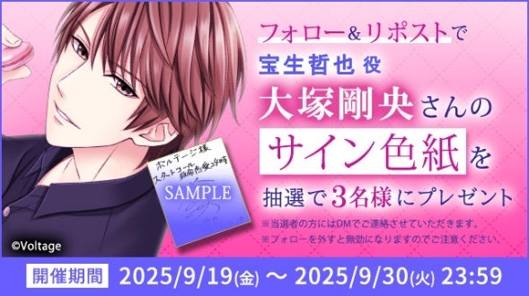 期間中、「100シーンの恋+」公式Xをフォローし、該当ポストをリポストすると、抽選で3名様に宝生哲也役大塚剛央さんのサイン色紙をプレゼントいたします。