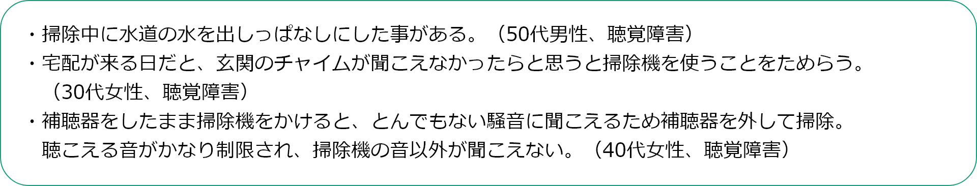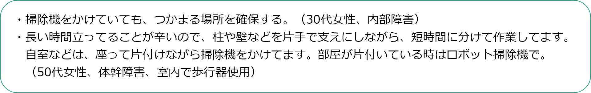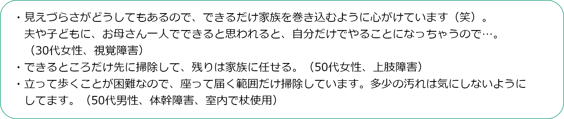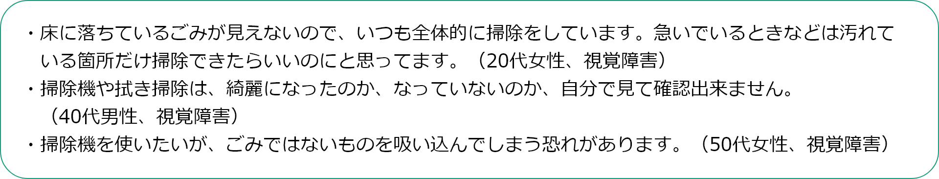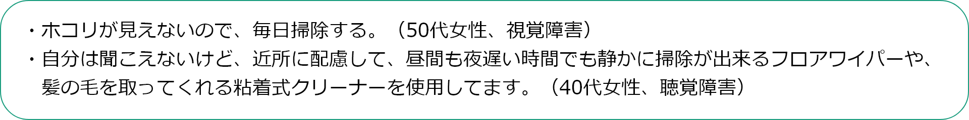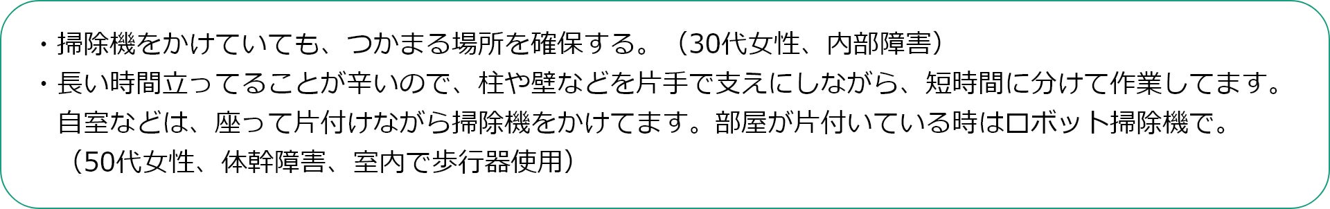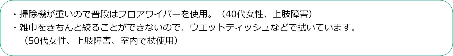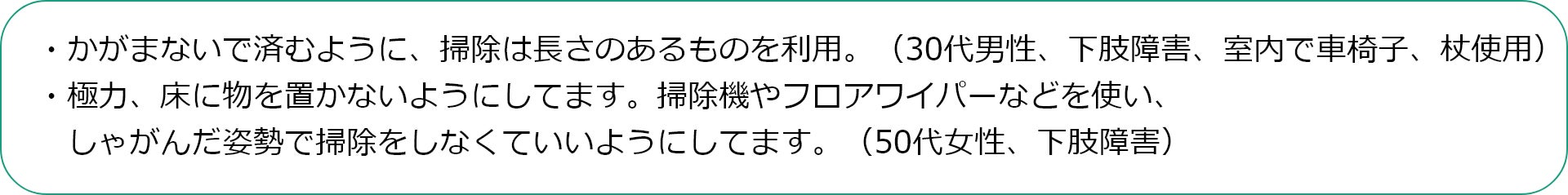 アンケート結果からは、身体への負担を極力避け、楽になる道具を選んだり、汚れが見えないから、毎日掃除をしたり、聞こえなくても周囲には騒音の配慮をするなど、「できる範囲の掃除は自分でしたい」そんな思いを大切にしていることが伝わってきました。