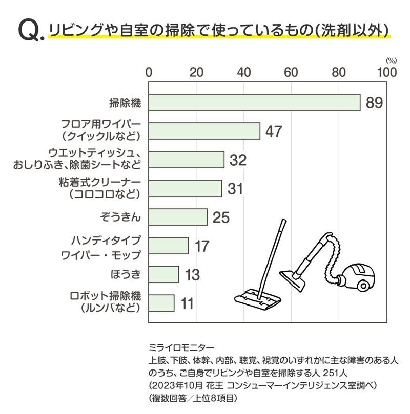 花王株式会社では、暮らしに関わる様々な調査を行っています。今回は、株式会社ミライロの協力を得て、普段知る機会が少ない「身体に障害がある人のお掃除」についてのアンケート結果を、My Kao「くらしラボ」(※1)にて2023年12月19日に公開いたします。