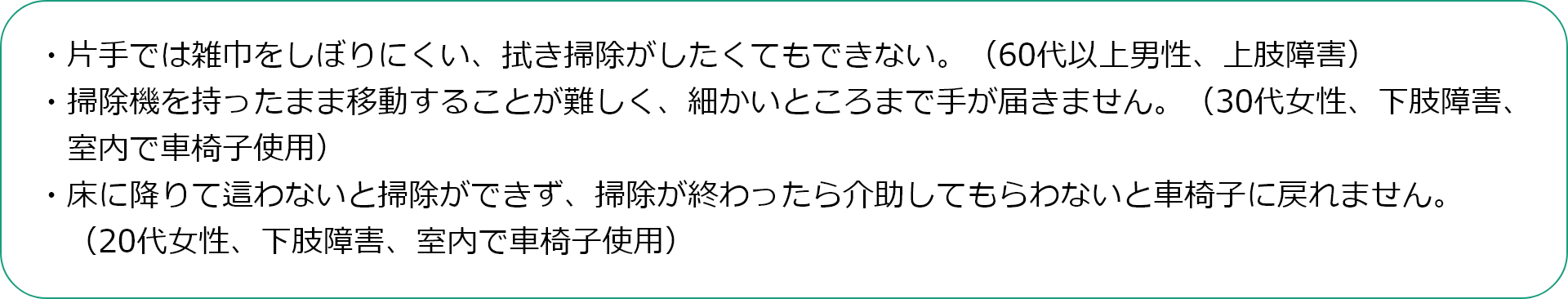 障害の種類によっては「力を入れる」「長時間立つ」「前かがみになる」「しゃがむ」という動作が難しかったり、「雑巾を絞る」「掃除機を持って移動する」という行為が負担になったりすることも。また、視覚障害では、そもそも「ホコリや汚れが見えにくい」「掃除の仕上がりが確認できない」など、掃除をする動作以外での困りごともあがりました。