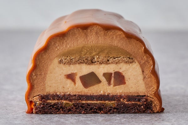 いが栗の中から顔を出すSuicaのペンギンと子ペンギンがキュート。チョコレートのクッキーとビスキーに、笠間の栗の渋皮煮の入ったマロンババロアとコーヒーブリュレを重ね、キャラメルチョコレートムースで包んだ、大人な味わいのケーキです。