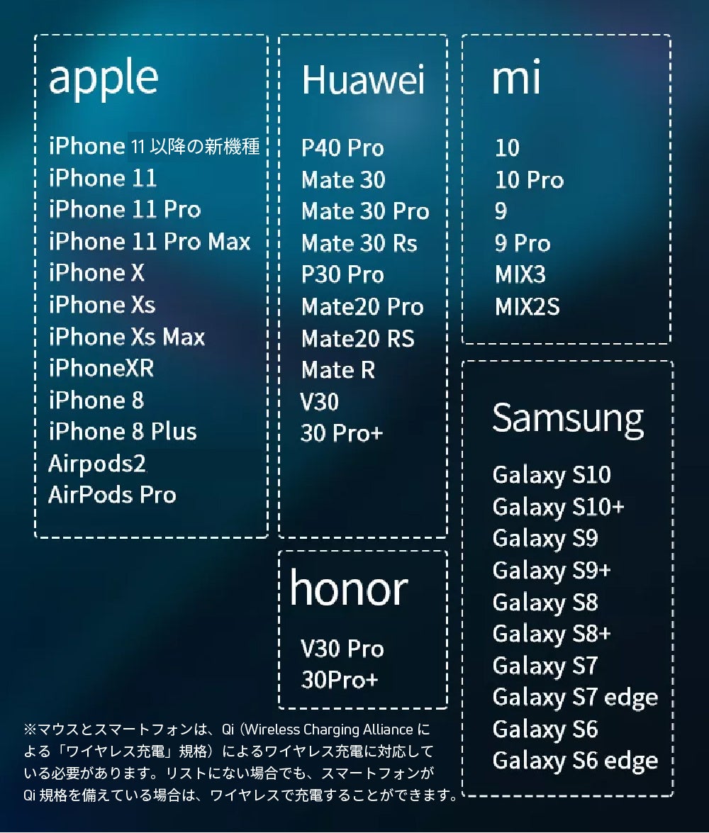 - iPhoneやAndroidのスマホなどQiワイヤレス充電