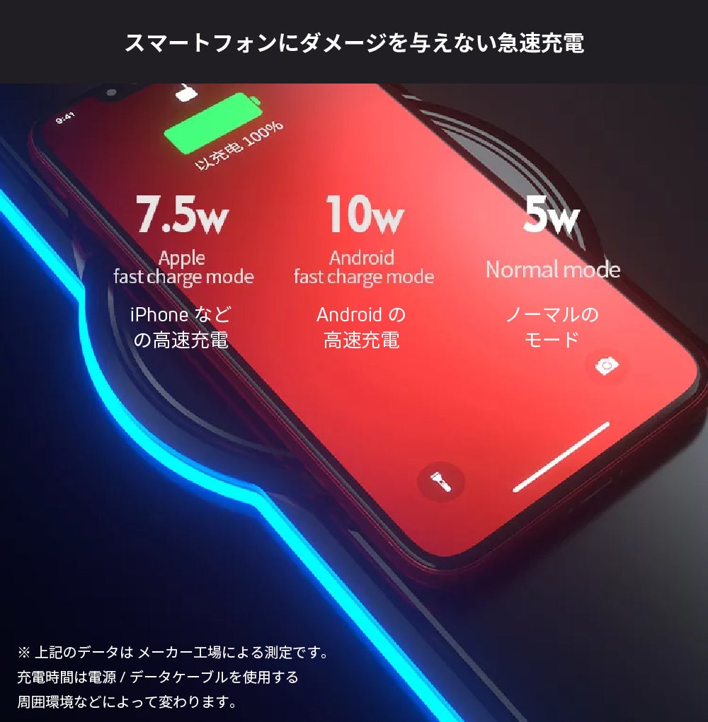 ゲーミング用に/カスタムできるLEDライト/iPhone・Androidスマホをワイヤレス充電/IP54