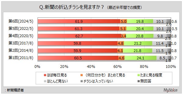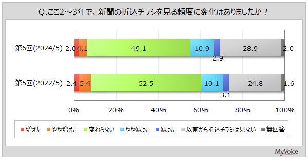マイボイスコム株式会社(東京都千代田区、代表取締役社長:高井和久)は、6回目となる『新聞の折込チラシの閲覧』に関するインターネット調査を2024年5月1日~7日に実施しました。