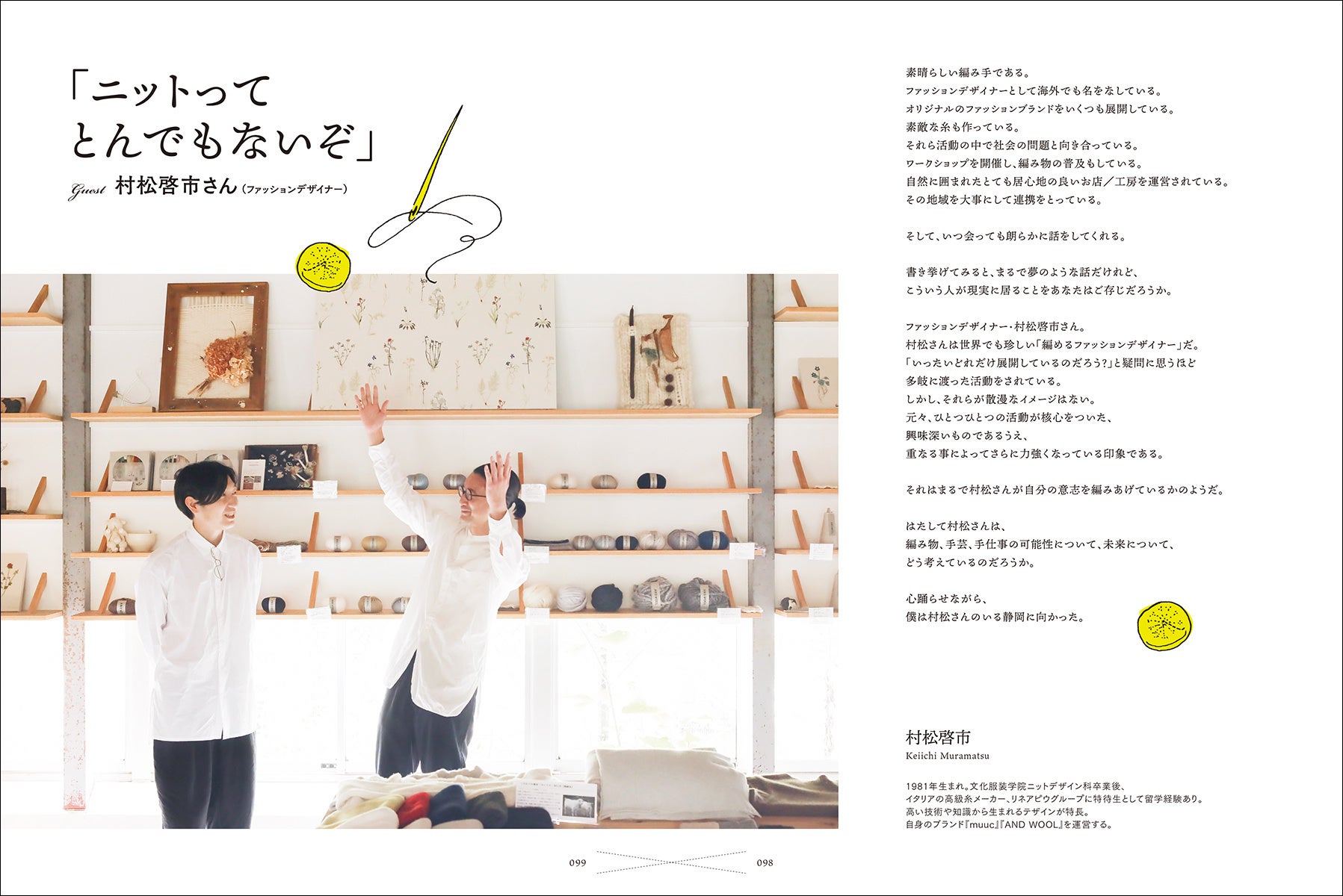 編み物作家、小説家、NPO法人 LIFE KNIT 代表、チューリップ株式会社 顧問、株式会社日本ヴォーグ社「編み物チャンネル」顧問/ナビゲーター。大学院在学中に『伝統のニット「てづくりのもの」のなかにある不思議なもの』(日本編物文化協会)を執筆。編み図なしで自由に編む「スキニ編ム」を提唱。仏ファッションブランド「Chloé」など、業界外企業の主催イベントでワークショップ講師も多数つとめる。「HUFFPOST」などWEBメディアでコラムを執筆。2021年、『どこにもない編み物研究室』(誠文堂新光社)を発刊。2022年、小説『編み物ざむらい』(角川文庫)を上梓し、好評を得て続刊執筆中。