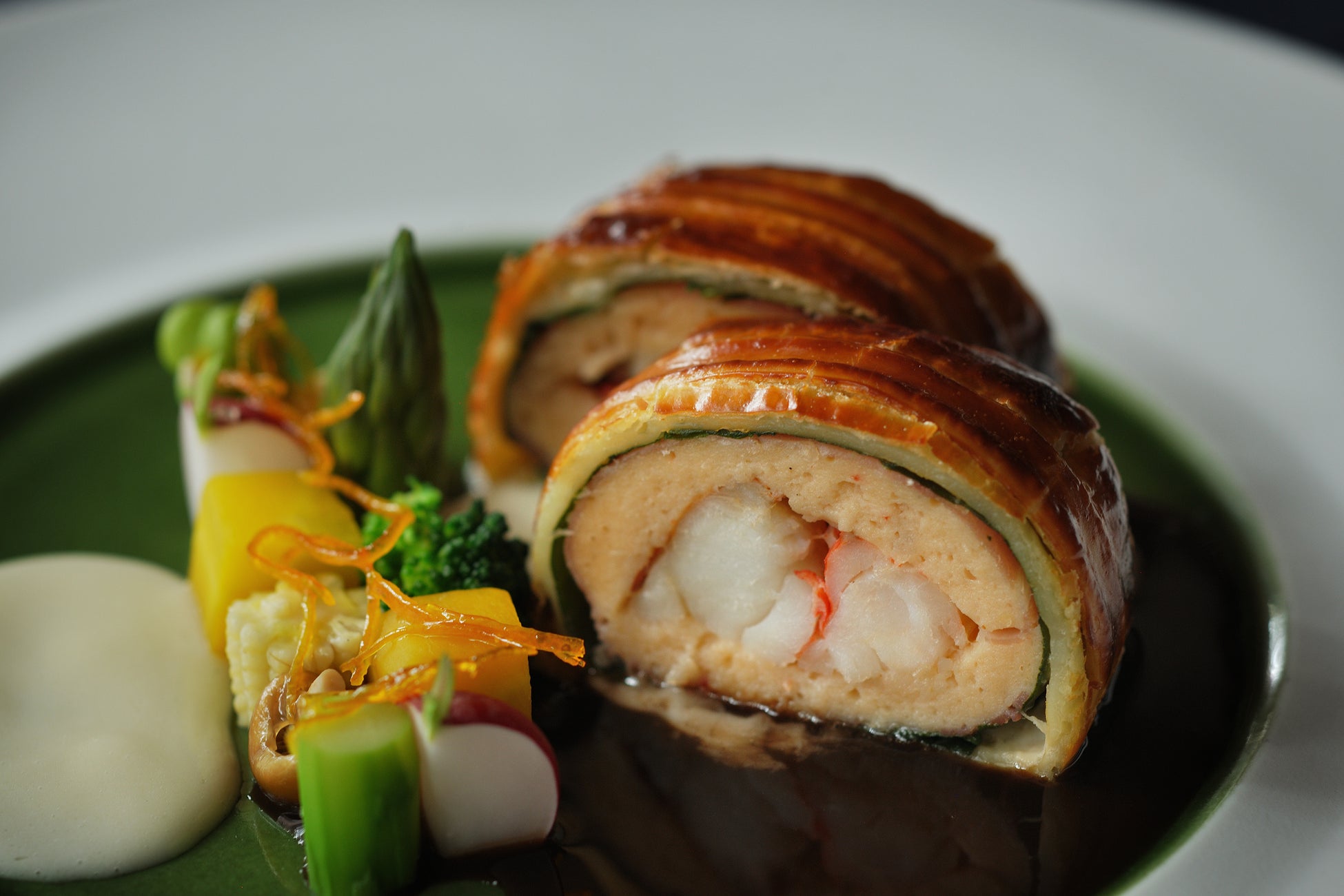 ■魚料理 「イセエビのパイ包み焼き 2色のソース」