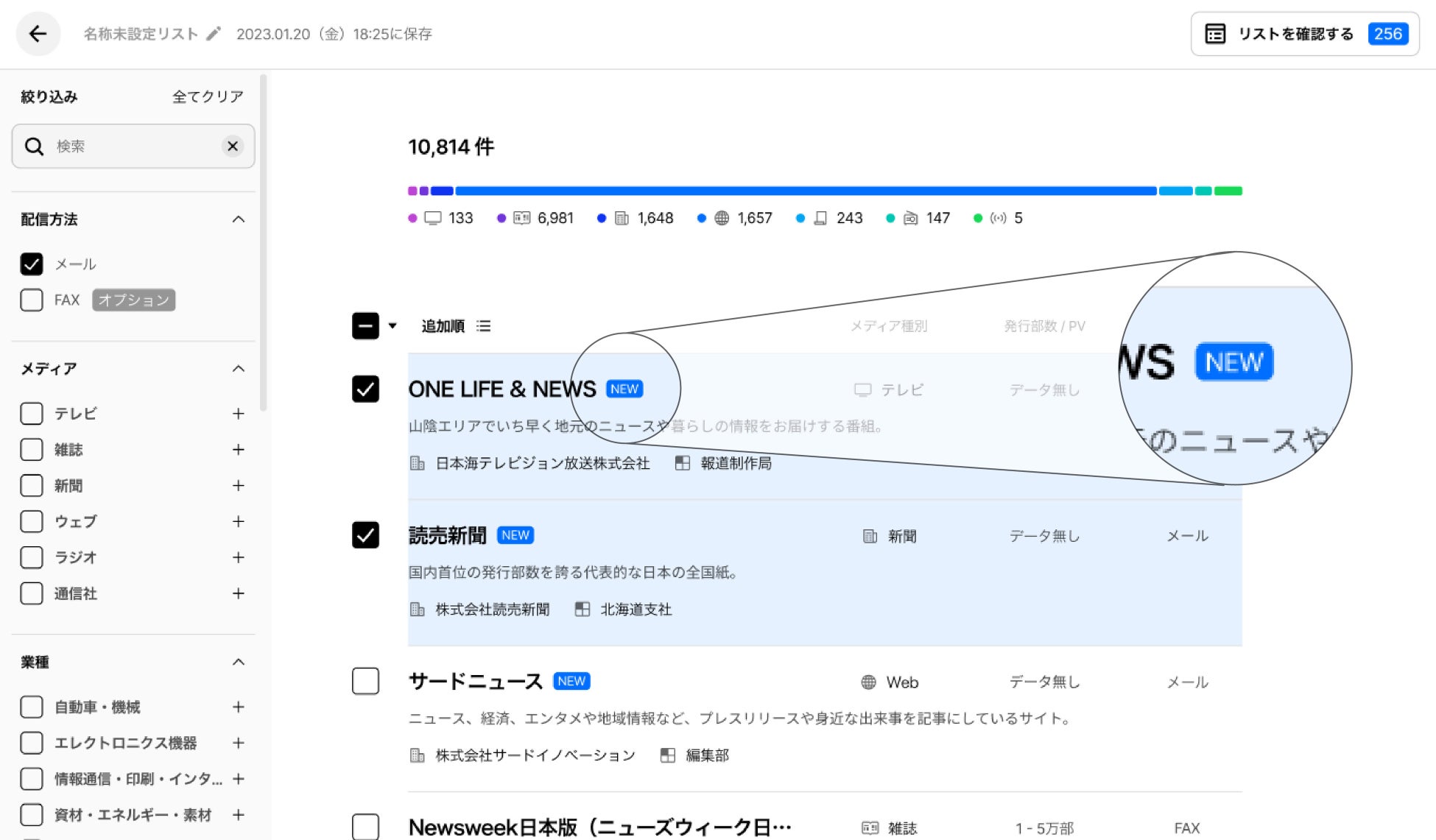 新着メディアを優先表示&直感的な絞り込みで発表情報に合ったメディアを選定