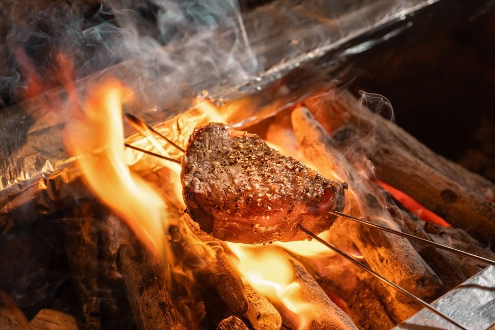 店内に入るとまず、目に飛び込んでくるのが、炭焼きなどを間近に臨む調理風景。まるでキッチンに迷いこんでしまったかのような演出が施された空間が広がります。