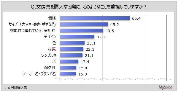 文房具購入者の重視点は(複数回答)、「価格」が65.4%、「サイズ」「機能性に優れている、実用的」が各40%台、「デザイン」が32.3%です。