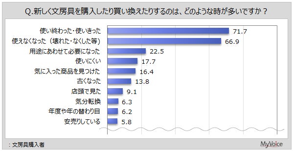 文房具購入者に、文房具を新しく購入したり買い換えたりするのはどのような時かを聞きました(複数回答)。