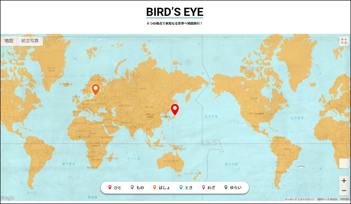 ひと、もの、ばしょ、とき、わざ、ゆらいの6つの視点で、ミグラテールのサイト内にアップされた全ての記事を世界MAPに分布します。国境や大陸を超え、鳥の目線で手芸の世界を俯瞰すれば、地域性や自然環境との関係性が見えてくるかもしれません。