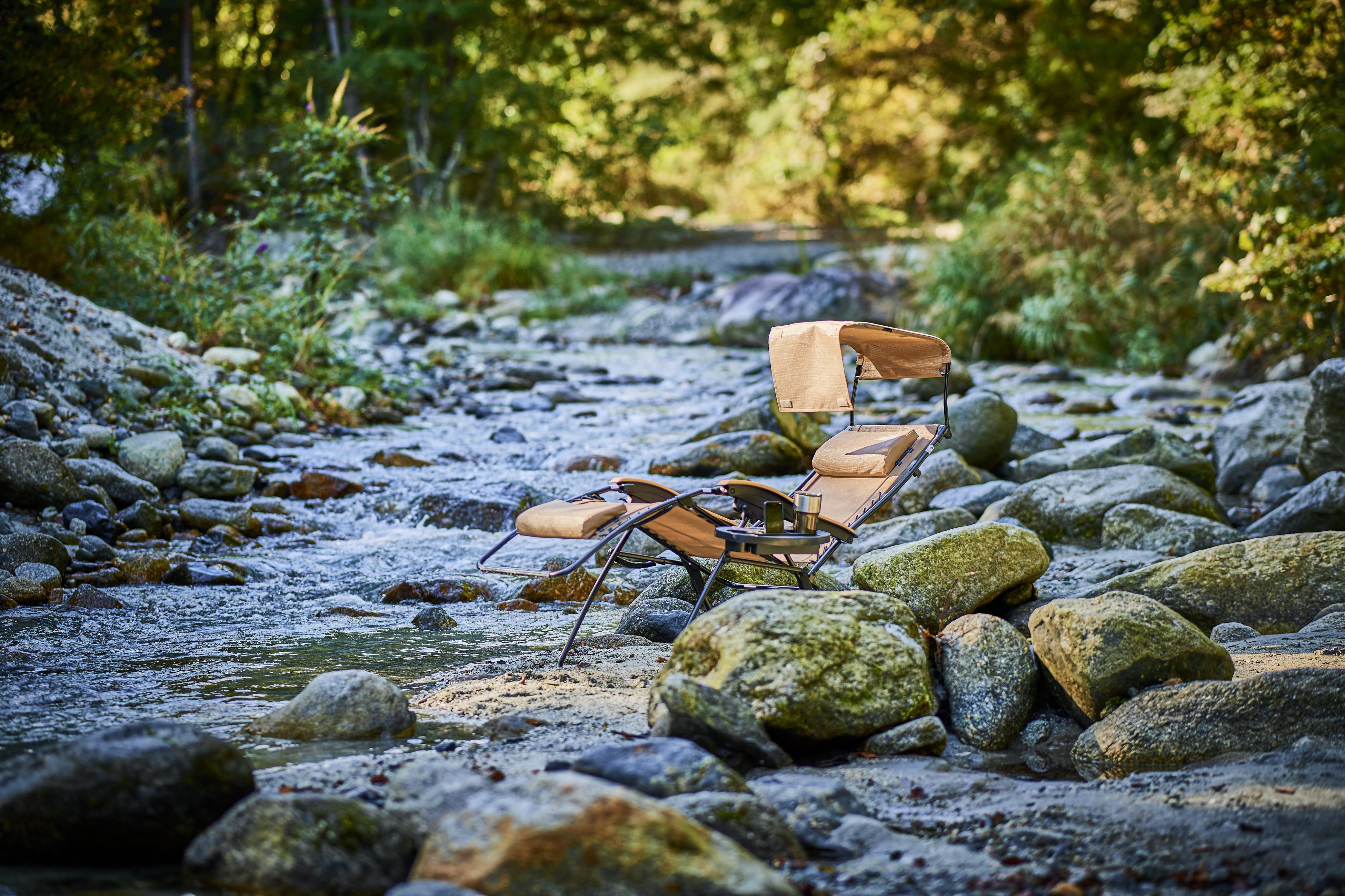 リラックスを追及した贅沢なアウトドアチェア。座ったままリクライニングすることが可能で、まるで雲の上に寝転んでいるような上質な座り心地を感じられます。