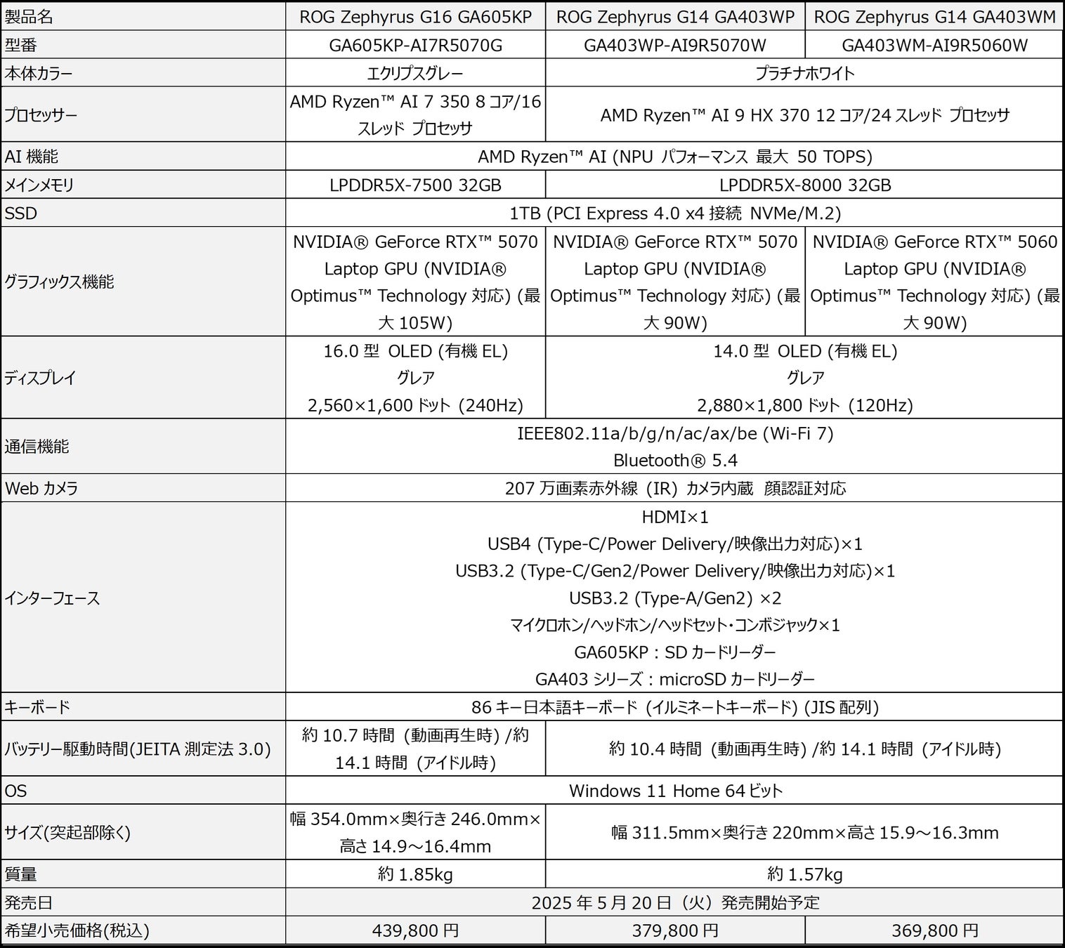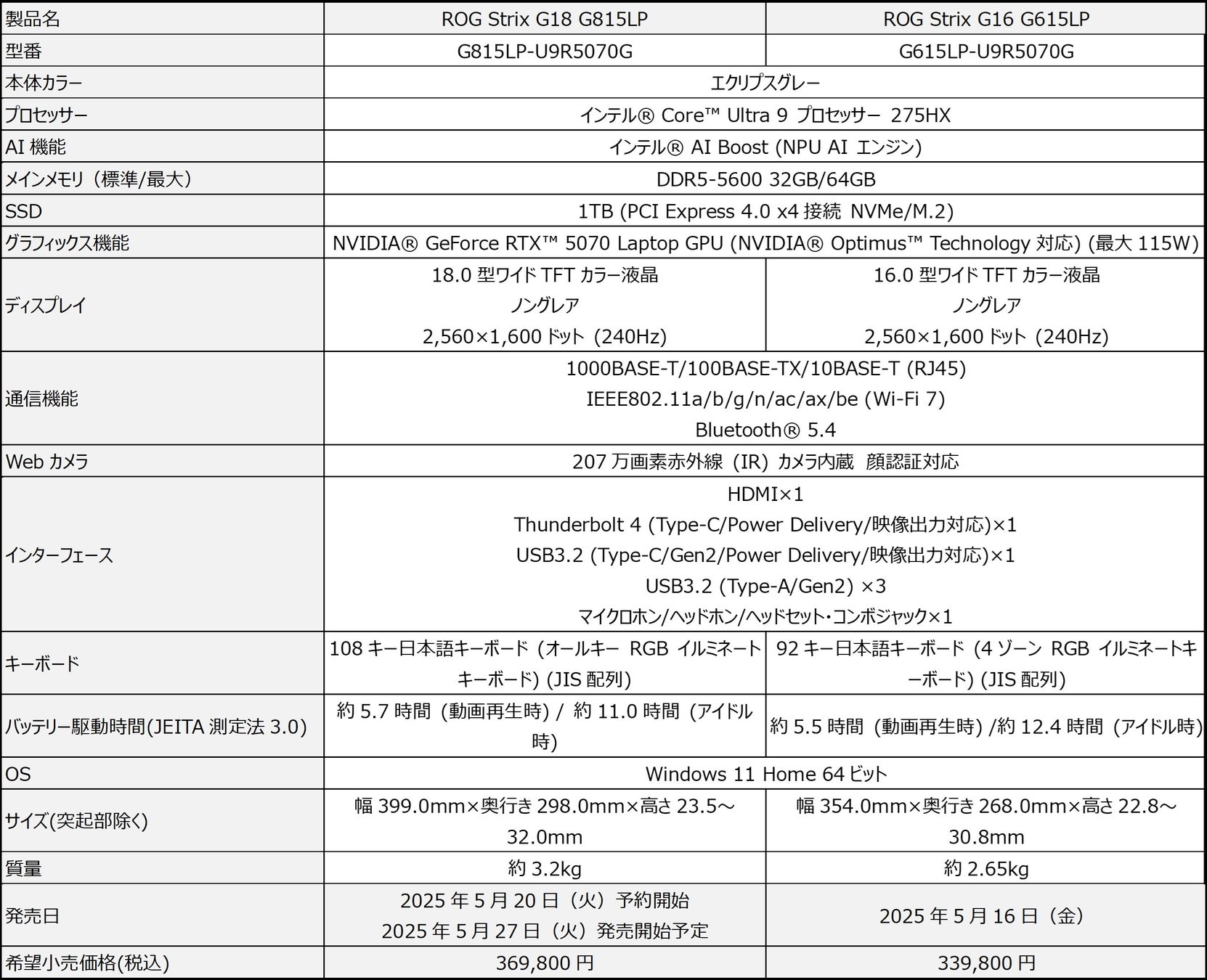 ASUS JAPAN株式会社は、ASUSのゲーミングブランド「Republic of Gamers(ROG)」より、新しいGPU、NVIDIA® GeForce RTX™ 5070 / 5060 Laptop GPUを搭載した、ハイパフォーマンスゲーミングノートPC「ROG Strix G18 G815LP」、「ROG Strix G16 G615LP」、「ROG Strix G18 G814FP / G814FM」、「ROG Strix G16 G614FP / G614FM / G614PM」と、薄型軽量でゲームプレイにもクリエイターにも最適な「ROG Zephyrus」シリーズより、「ROG Zephyrus G16 GA605KP / GU605CM」「ROG Zephyrus G14 GA403シリーズ」7製品11モデル発表いたしました。本日より順次発売開始となります。