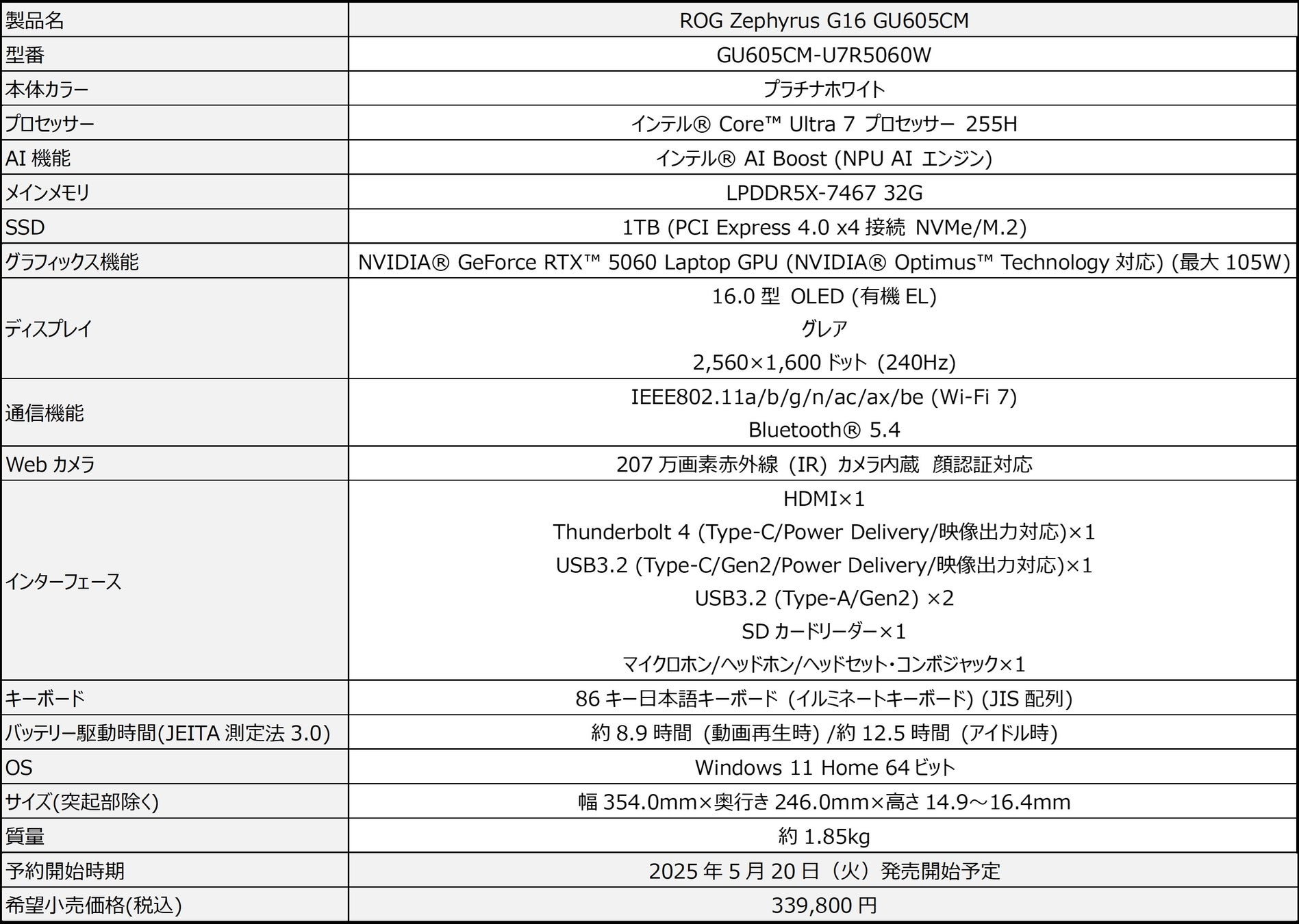 ※ROG Zephyrus G16 GU605CMの詳細スペックはこちらからご確認ください。