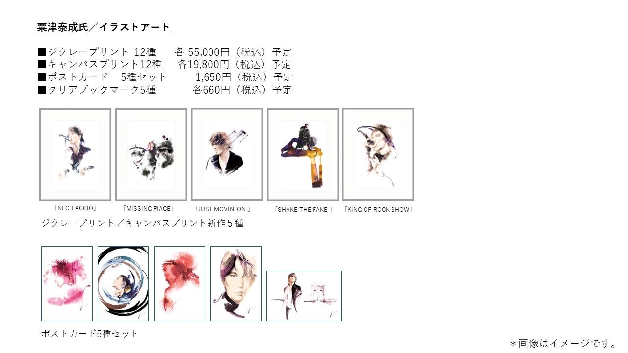 また、展示作品をご自宅でも楽しめるように製作された「KYOSUKE HIMURO ART COLLECTION」からは、本展のメインビジュアルでもある平野氏のアートワークを複製したキャンバスプリントや、粟津氏の作品の複製画として、これまで販売していたジクレープリント7種に加え、新たに5種のジクレープリント作品の販売も予定しております。そのほか、ポストカードやクリアブックマーク、クリアファイル等も販売いたします。こちらはオンラインでも7月24日(水)13時より受注を開始いたします。