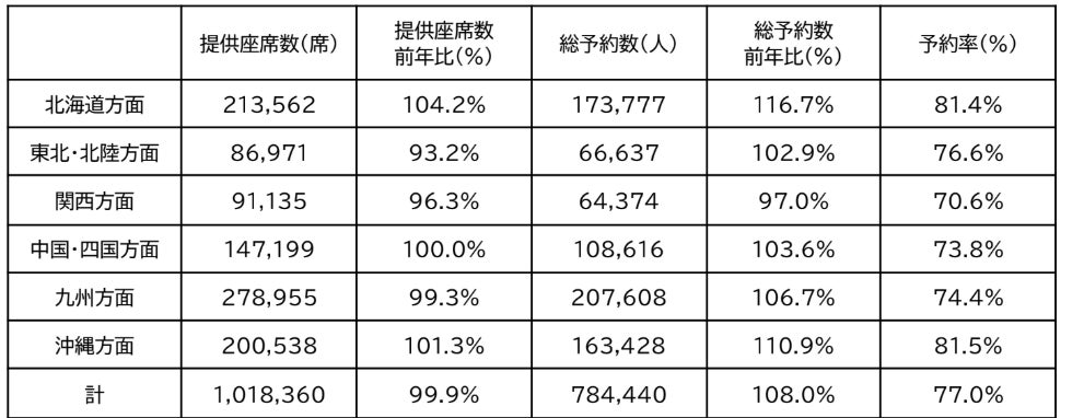 ● 予約数は前年を上回って推移しています。方面別では、特に、北海道・沖縄方面にて前年を大き く上回るご予約をいただいております。