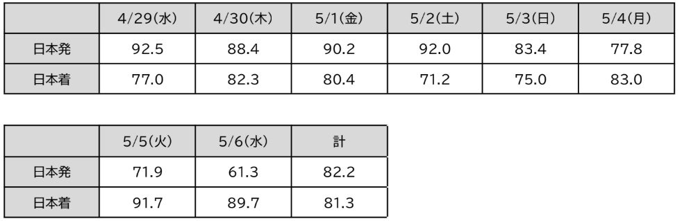 ● GW期間の予約率としては、コロナ後過去最高の81.8%となりました。なお、日本出発のピーク は4月29日、日本到着のピークは5月5日となっています。