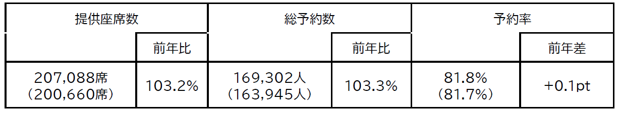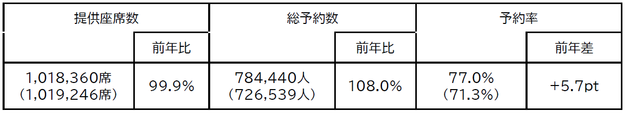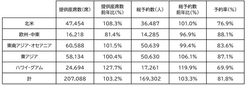 ● 総予約数は前年並みで、北米、東アジア、ハワイ・グアム路線を中心に前年を上回るご予約をい ただいております。