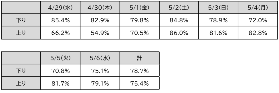 ● 期間中は、下りが4月29日、上りは5月2日をピークに、予約率の高い日が続いています。